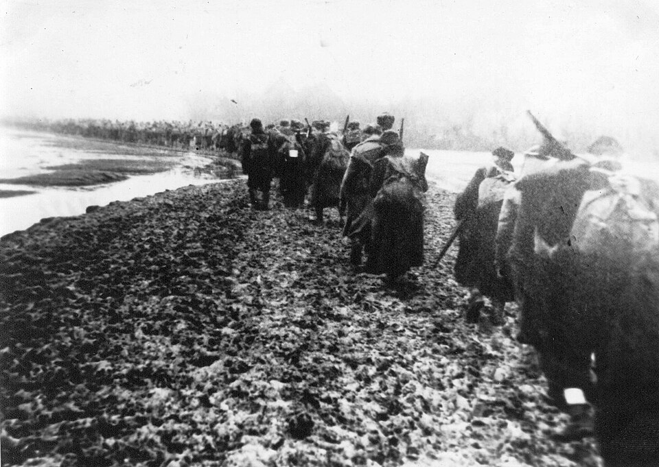 (左)ザグレブ西方サヴァ川に向かう第14師団 (右)負傷者を雪の中運ぶ第14師団 (共にパブリックドメイン)