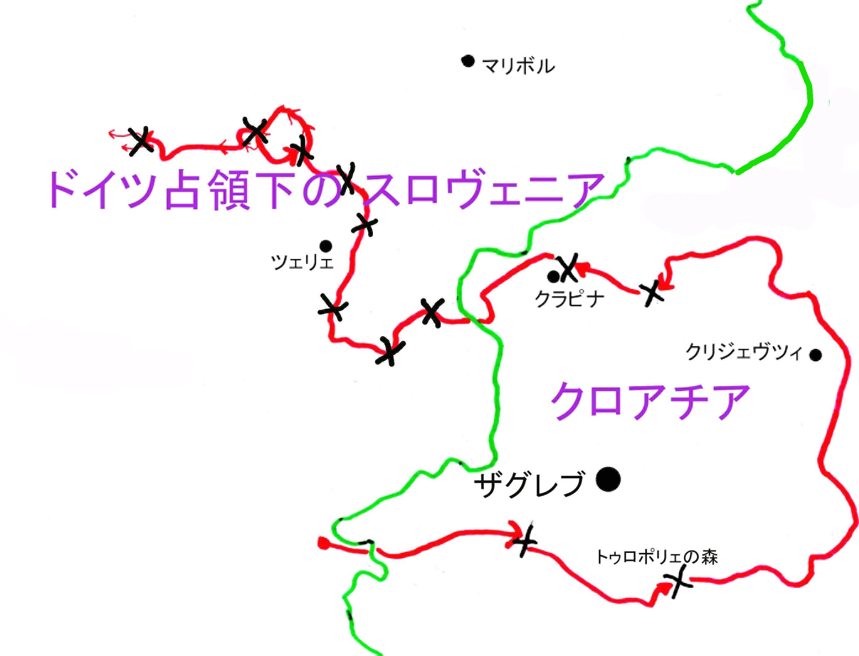 (左地図)赤線が14師団の行軍ルート。緑線は1941–45 年のドイツ・ハンガリー占領地域とクロアチア独立国(NDH)との境界線。×は主な交戦地