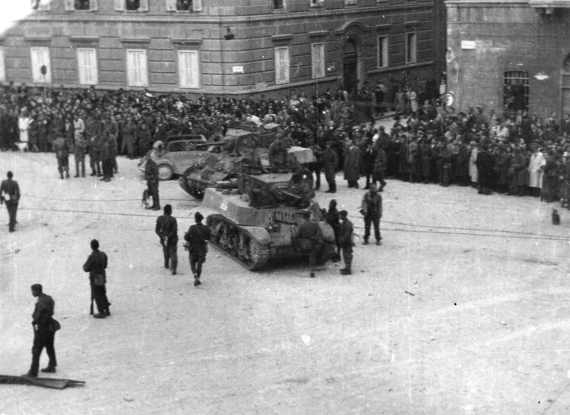 (左)イリルスカ・ビストリツァで捕虜になったドイツ軍の兵士たち (右)リュブリャナに入場したユーゴスラビア第4軍 (ともにパブリックドメイン)