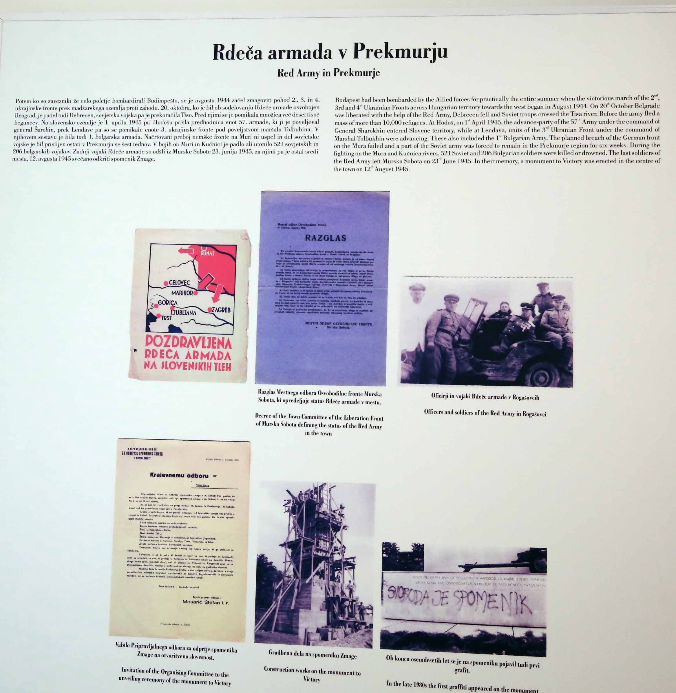 2025年4月筆者撮影の、プレクムリェのムルスカソボタ市中心部の「勝利の記念碑」。赤軍の勲章をバックに、ソ連兵とスロヴェニアパルチザン兵が並ぶ。戦後、ソ連とユーゴスラビアは関係が悪化するが、ソ連がこの地域を解放したことは史実なのでずっと建てられていると思われる。真ん中の、ロシア語とスロヴェニア語の碑文は共に「兄弟なるソ連邦とユーゴスラビアの自由と独立のための戦いで倒れた英雄たちに、永遠の栄光を」となっている。