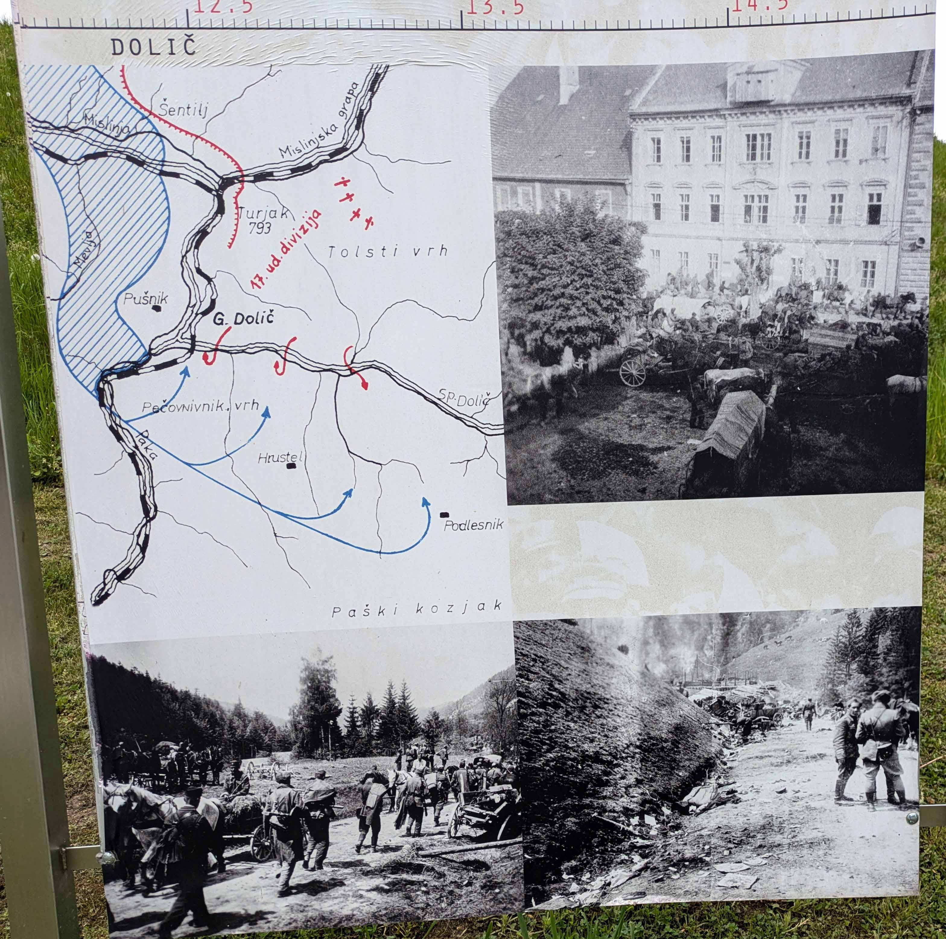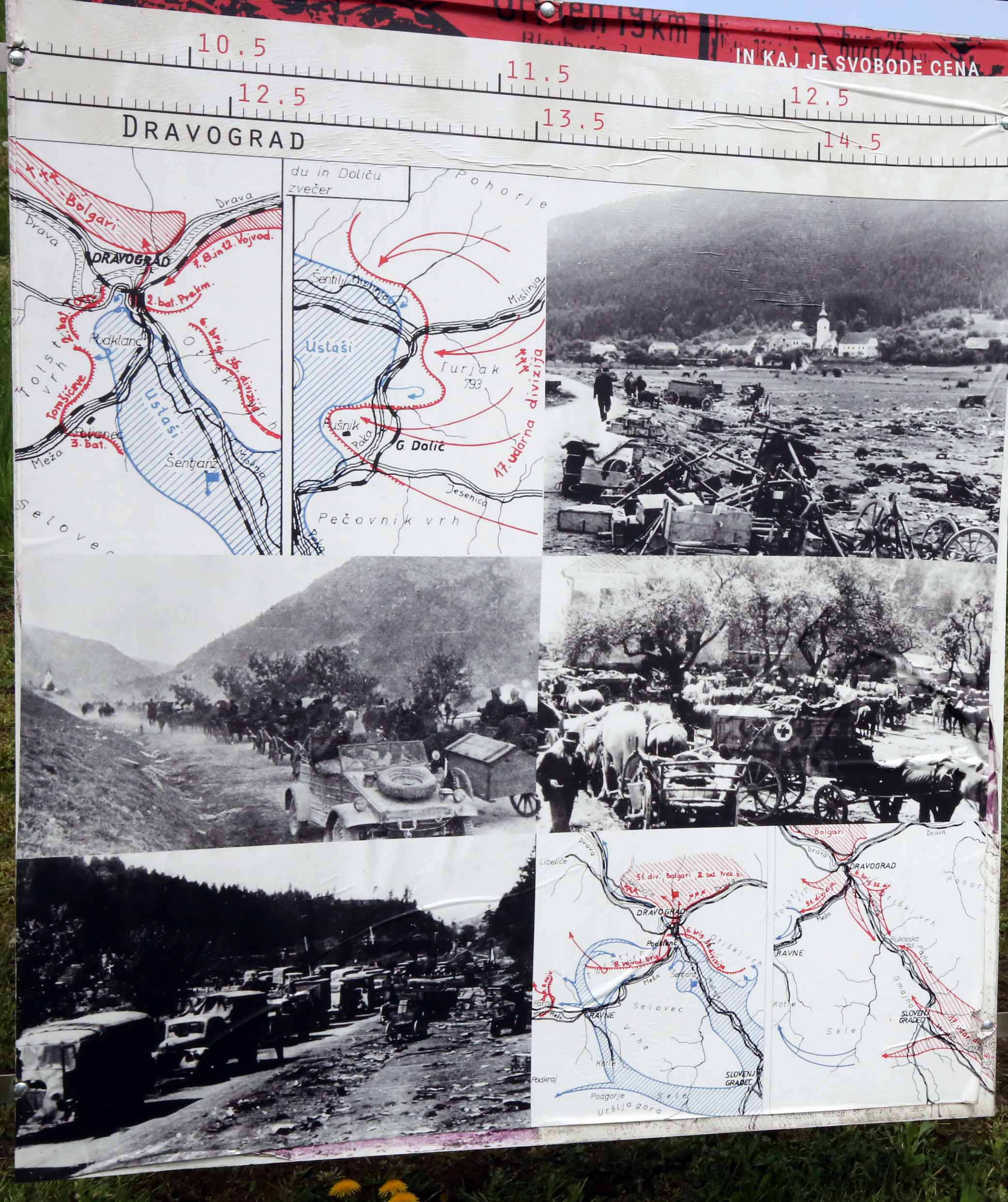 (右上)敗残兵集団のスロヴェニア・グラデッチからの撤退の写真。(右下)ドリッチの南フダ・リュクナでの戦闘の後の写真。Poljanaの屋外展示パネルより
