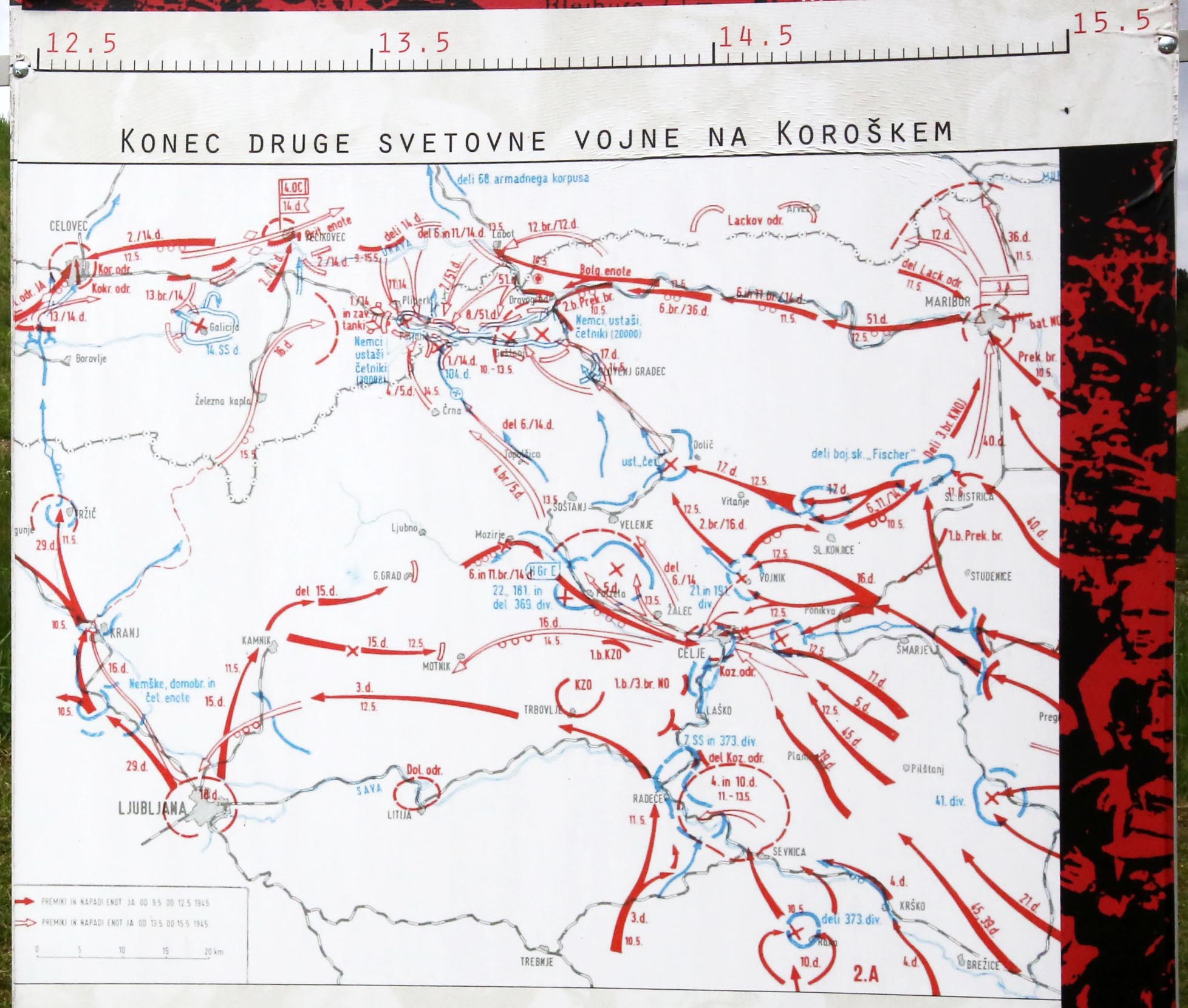 下の大きな図は、展示されていた、1945年5月9日から15日にかけての、スロヴェニア北部の最終戦況図。青矢印がドイツ軍やその協力者たちの動き。赤塗りつぶし矢印がスロヴェニア軍など解放勢力の5月9日から12日の動き。赤枠の白矢印が同勢力の5月13日から15日の動きを示している。それぞれの矢印に沿って書かれているのは部隊名。この戦況図と説明により、スロヴェニア戦線での最後の戦いの様子が分かる。