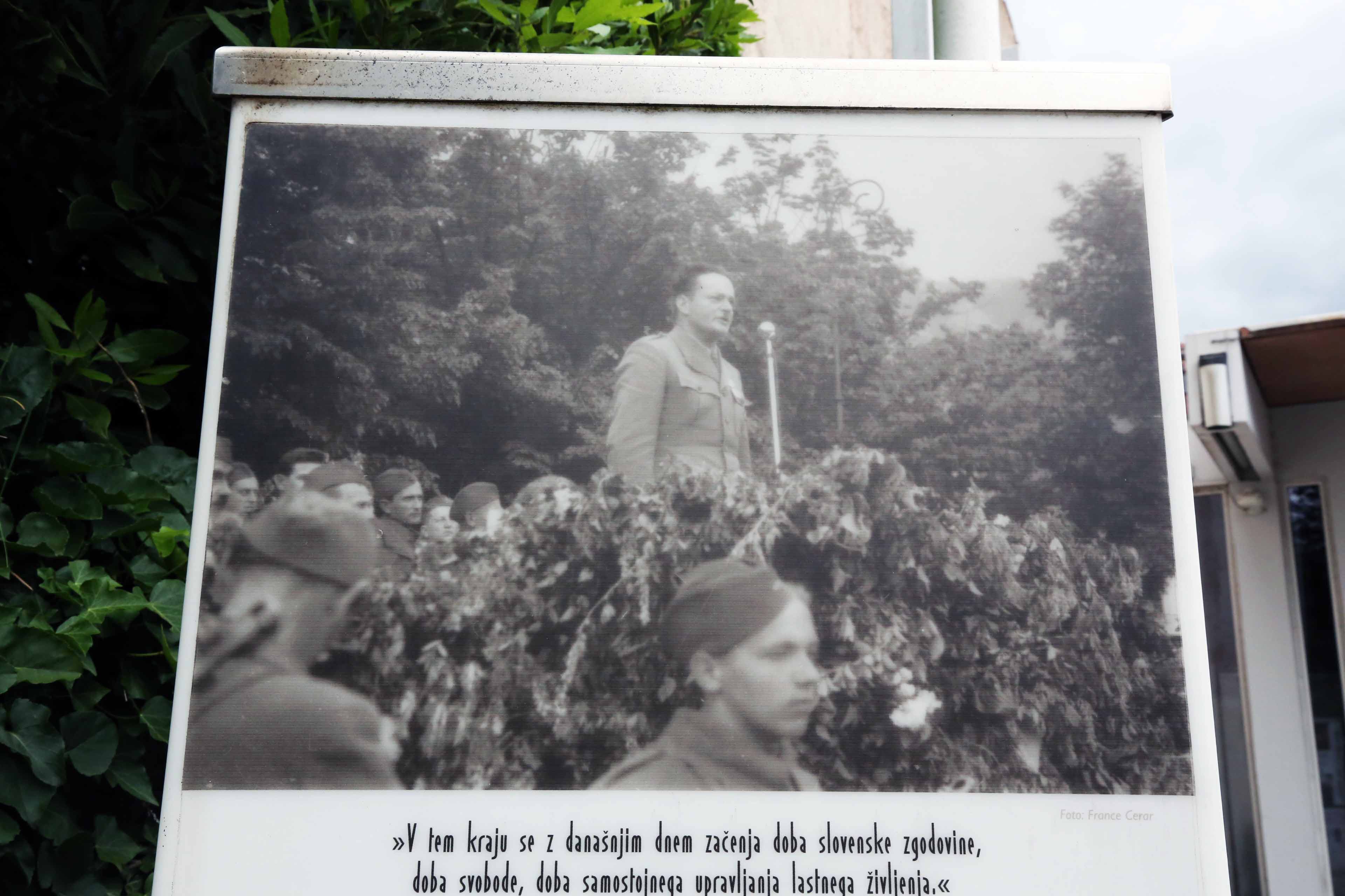 展示写真のキャプションは「今日この場所から、スロベニアの歴史の新しい時代、自由の時代、自らの生活を自ら管理する時代が始まる」