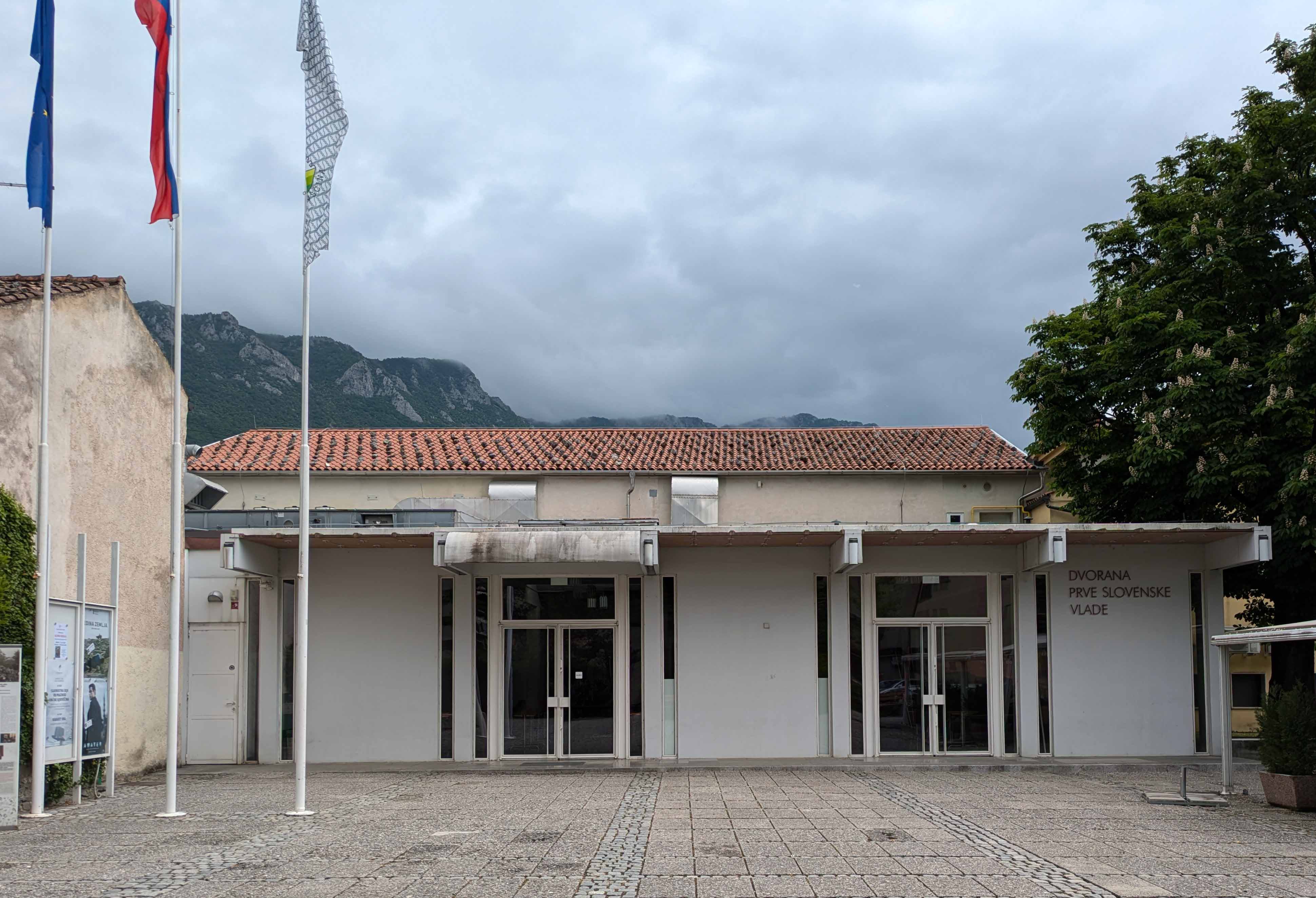 アイドフシュチナのDvorana prve slovenske vlade(最初のスロヴェニア政府の建物)の位置と、2025年には多目的ホールになっていたその建物(筆者撮影)