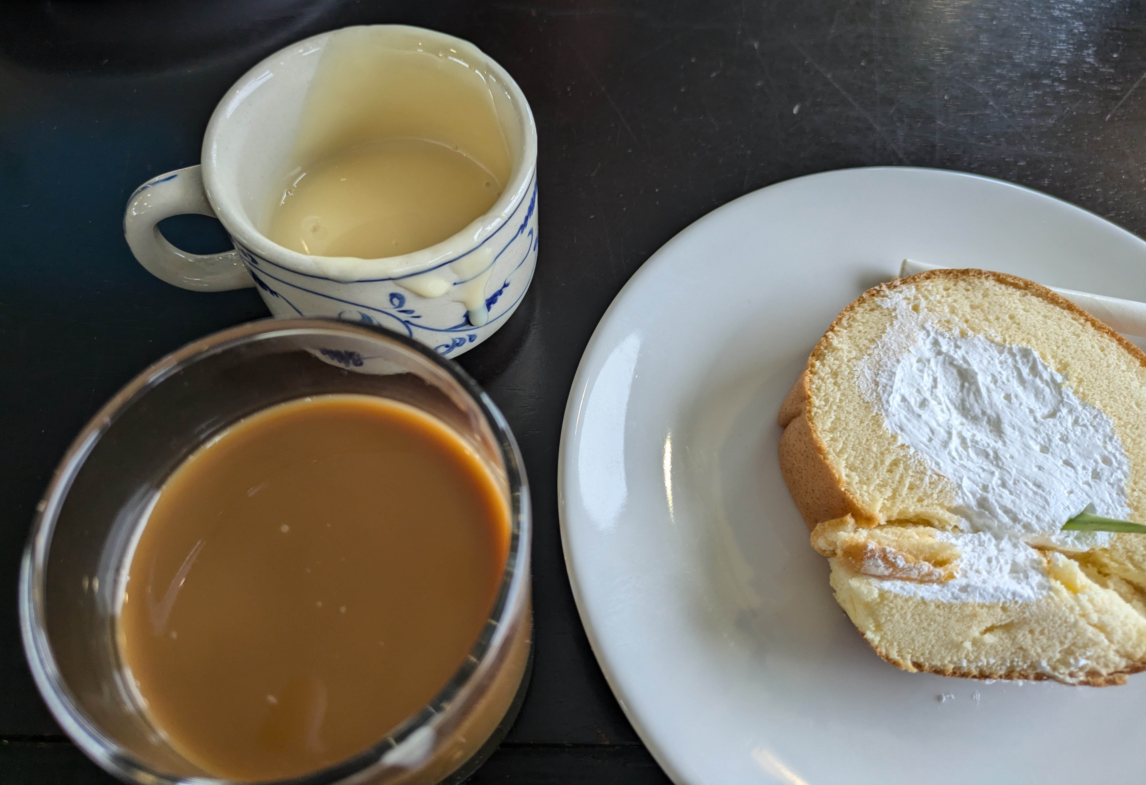 おやつに出た、ロールケーキと、甘いコンデンスミルク付きベトナムコーヒー