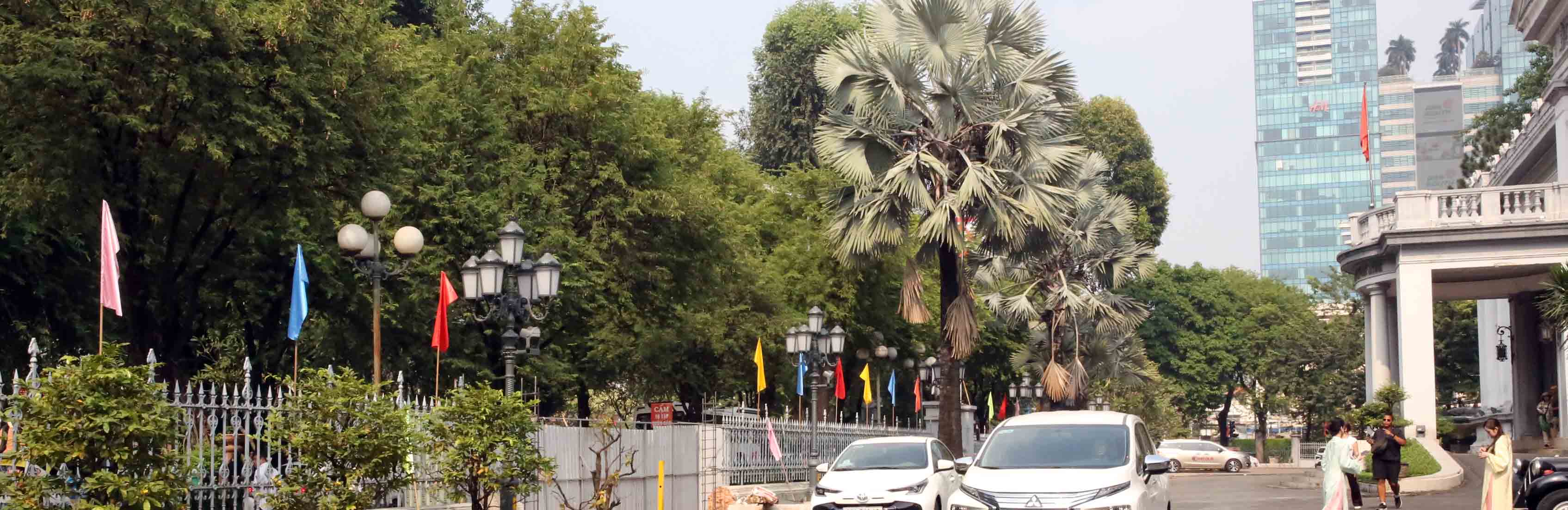 これは多色旗または多色縦旗と訳される旗で「多色縦旗とは、1枚につき1色の単色旗で、一般的に 縦長の長方形(比率 1:2) の形をしている。布地はあらかじめ染色された生地を使用し、印刷技術は使わないため、色の発色が良く、均一で、耐久性も高いのが特徴である。各旗は 赤・黄・青・緑・オレンジ・紫 などの単色。素材は 光沢のあるポリエステル生地(vải phi bóng) や軽くて丈夫なナイロン系生地(vải AC dù)で一般的なサイズは 40×80cm」(サイト「Cờ Sao 社の多色縦旗」より) 「多色の旗は祖国旗や党旗と組み合わせて掲げることもでき、国の重要な祝日に喜びと興奮を生み出す楽しい雰囲気を作り出します。」(サイト 「「Lá Cờ Việt社が製造する多色縦旗」 より)