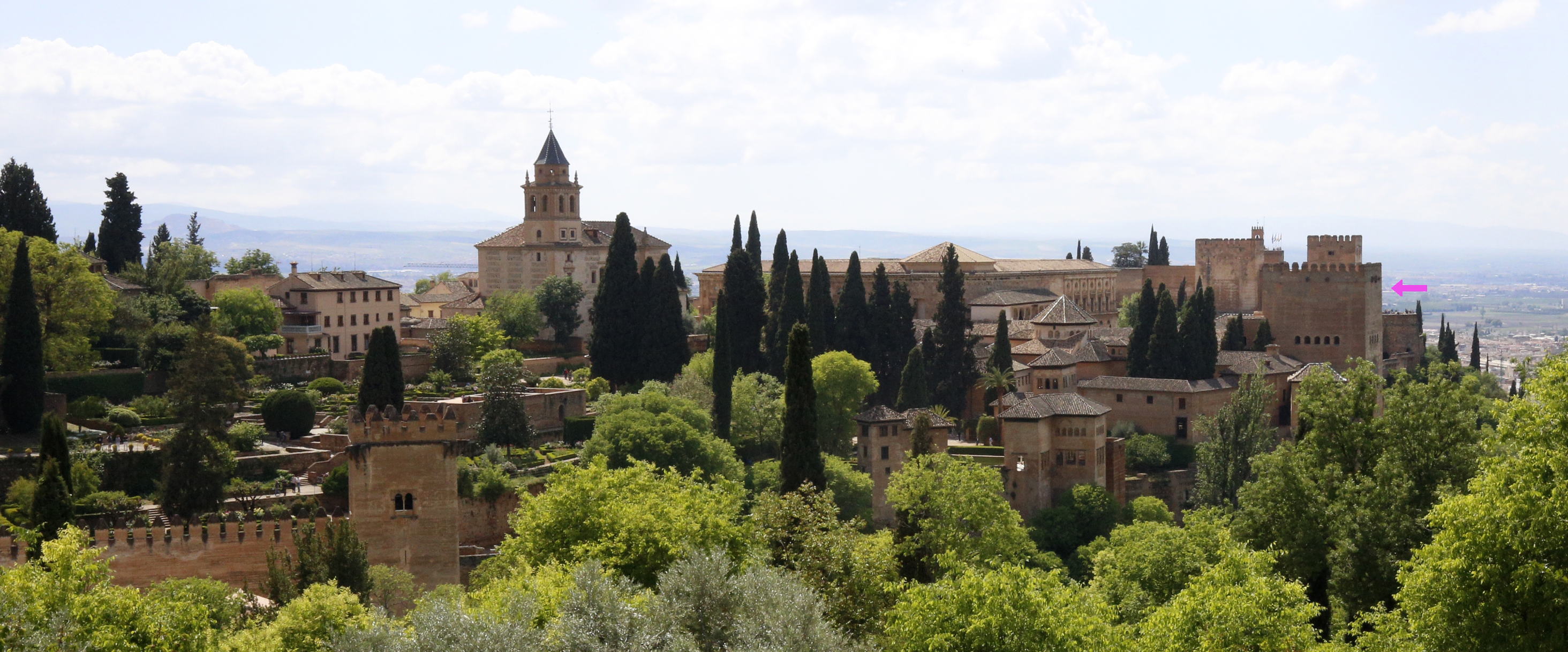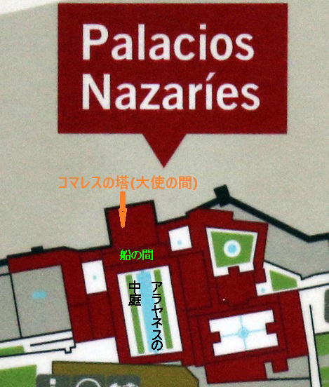 外から見ると、下の写真のピンクの←で示したところ。さらにその下の写真はコマレスの中庭から見た塔。この塔の中に「大使の間」がある。