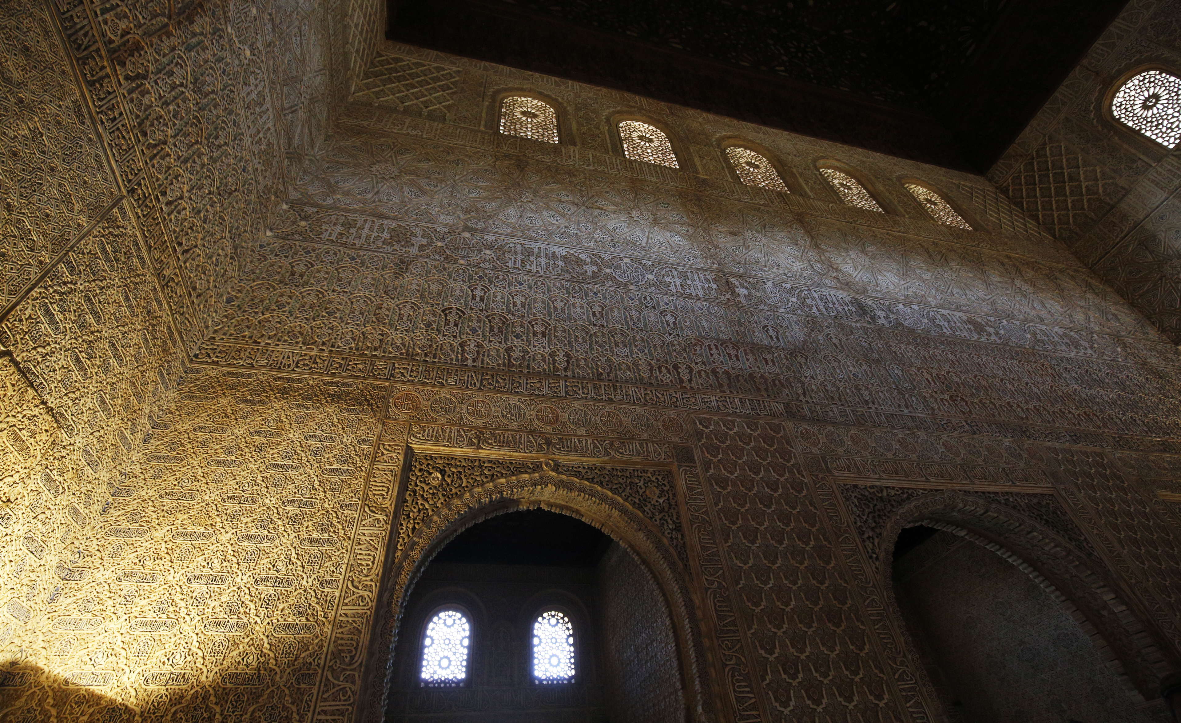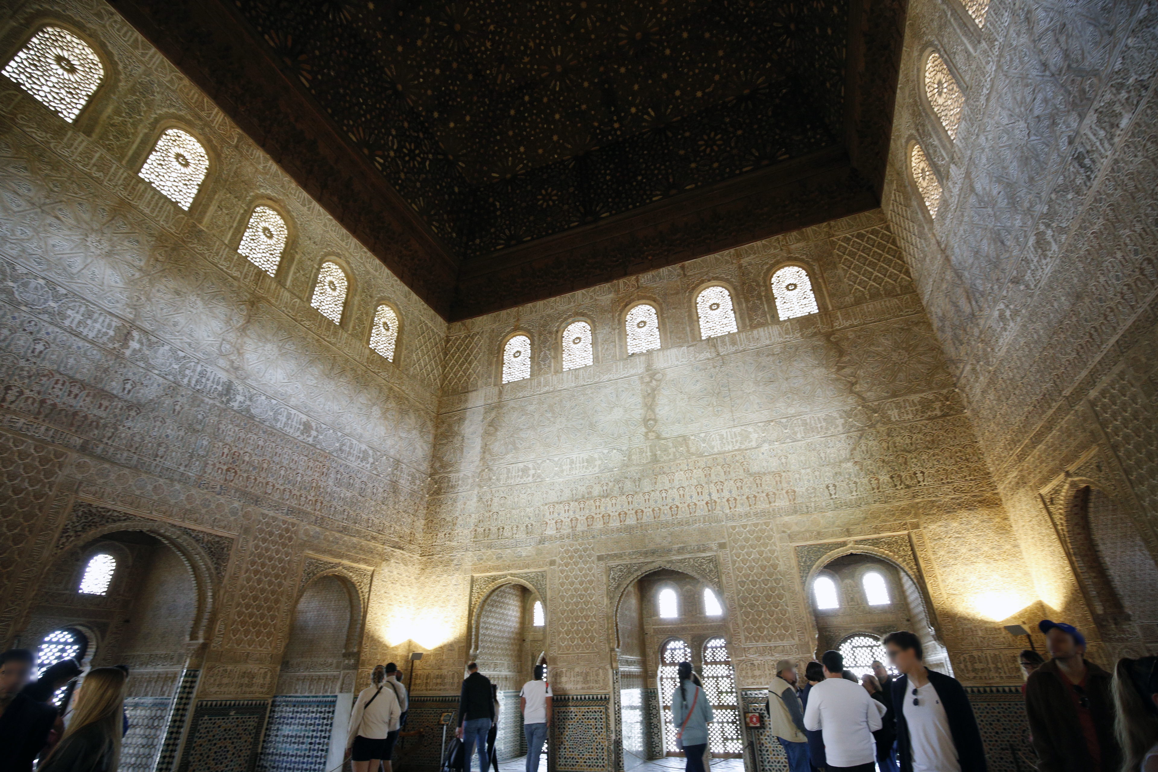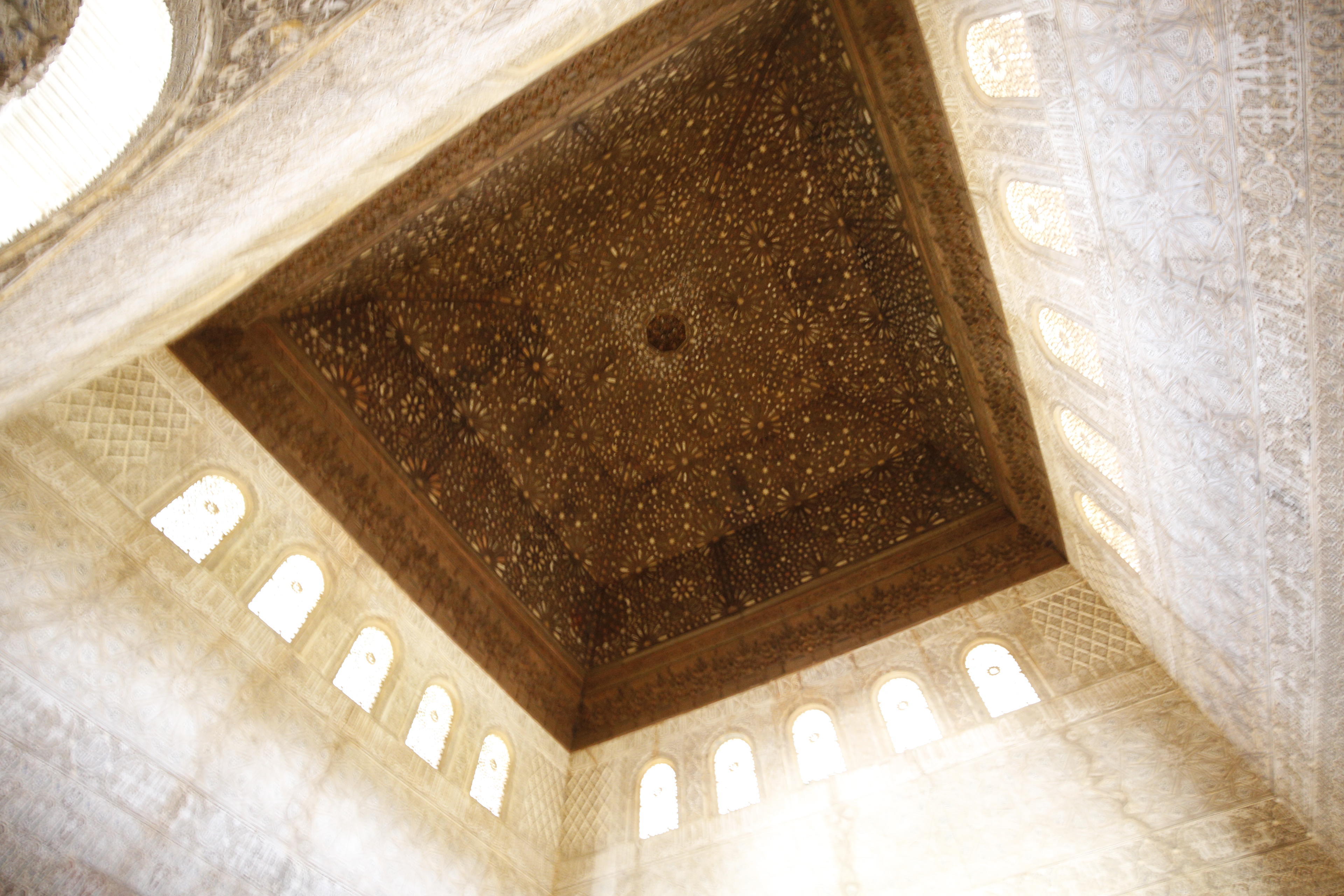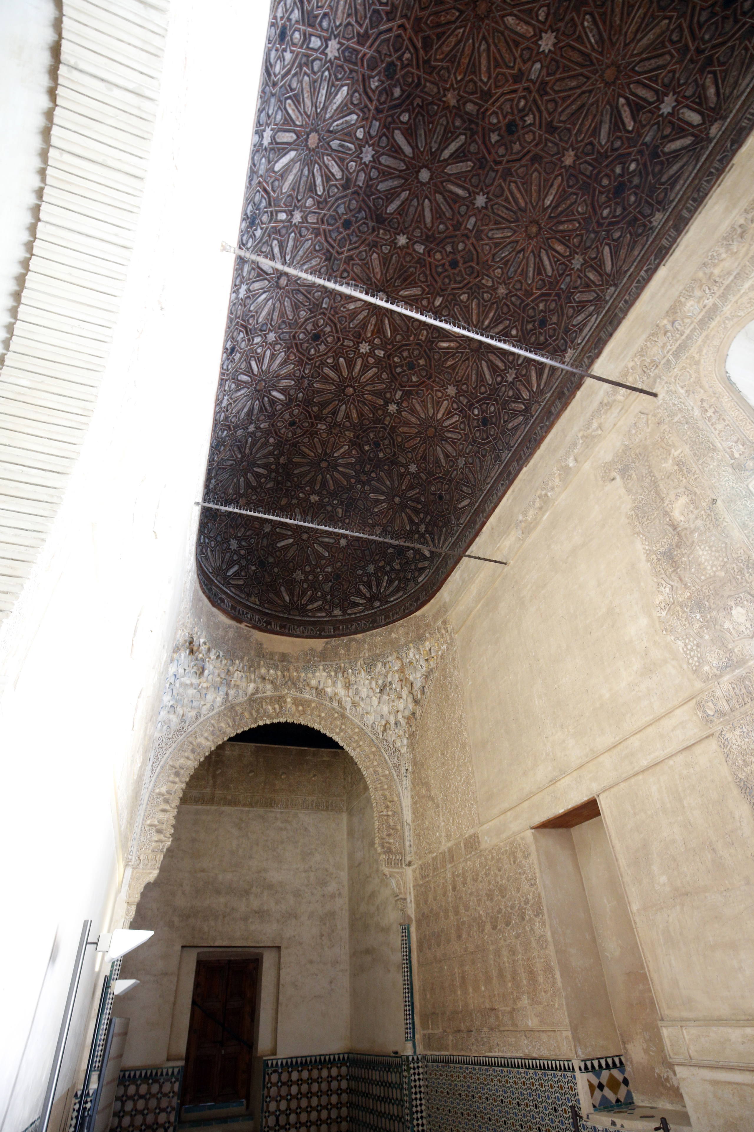 天井は「イスラムの天国にある七つの空の象徴で、中央の鍾乳石飾りの立方体には神の玉座が表現されており、そこから四方に四本の生命の樹が伸びています。」(サイト「AlhanbraDeGranda.org」より)