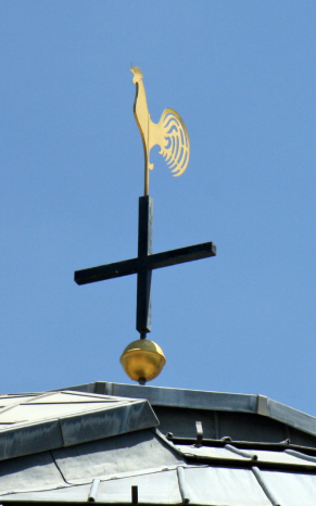 「イエスを知らない」と言うペテロの像と鶏のレリーフが置かれ、屋根にも鶏の像が据えられている。