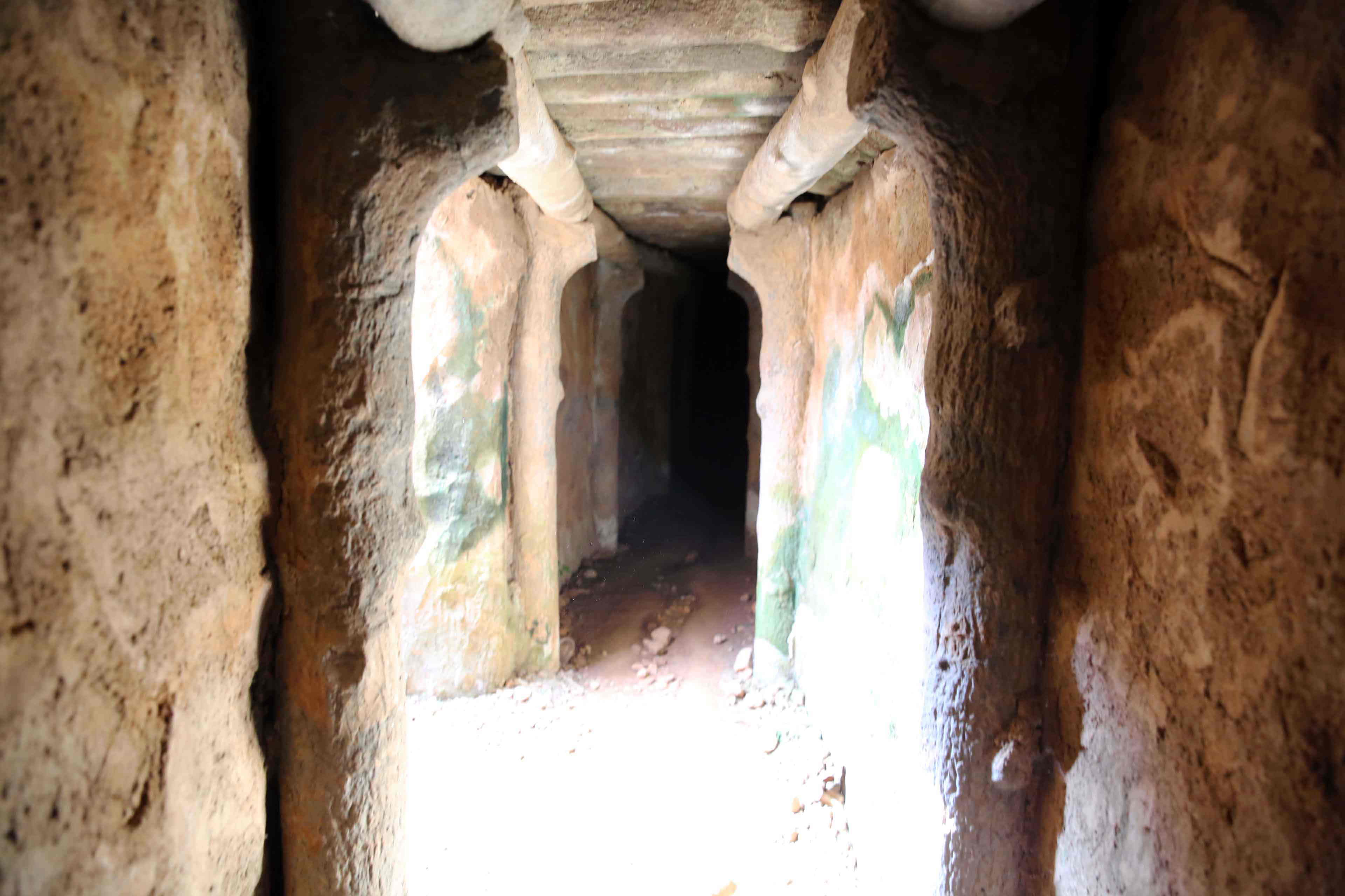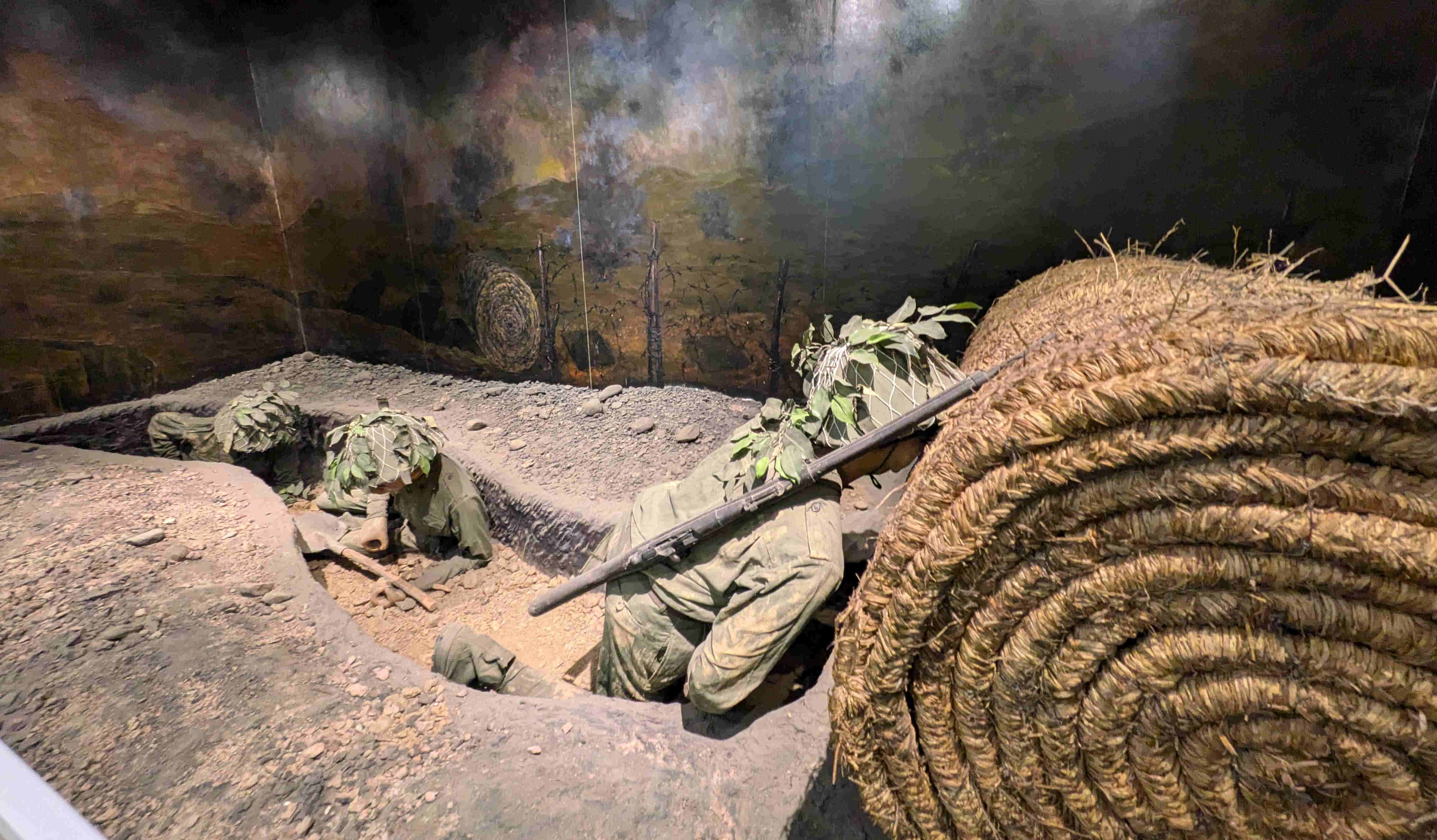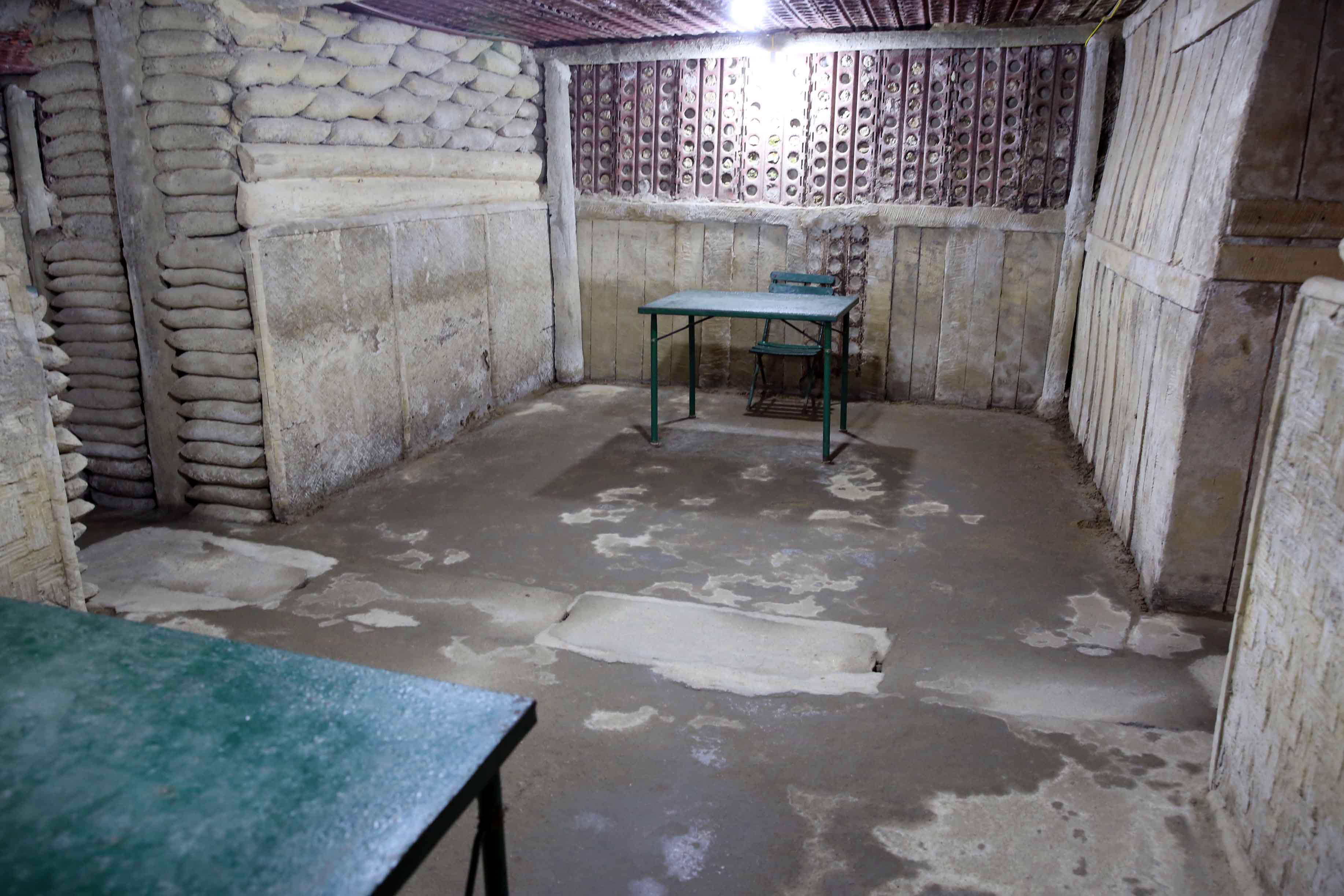 司令部は、塹壕の中に、土嚢で壁や天井を覆い、さらに天井に鉄板を敷き、加えて外には蒲鉾型に鉄板を被せて防御を固めていた。上のプラスチックの覆いは展示を守るため後にベトナムによって架けられたもの。