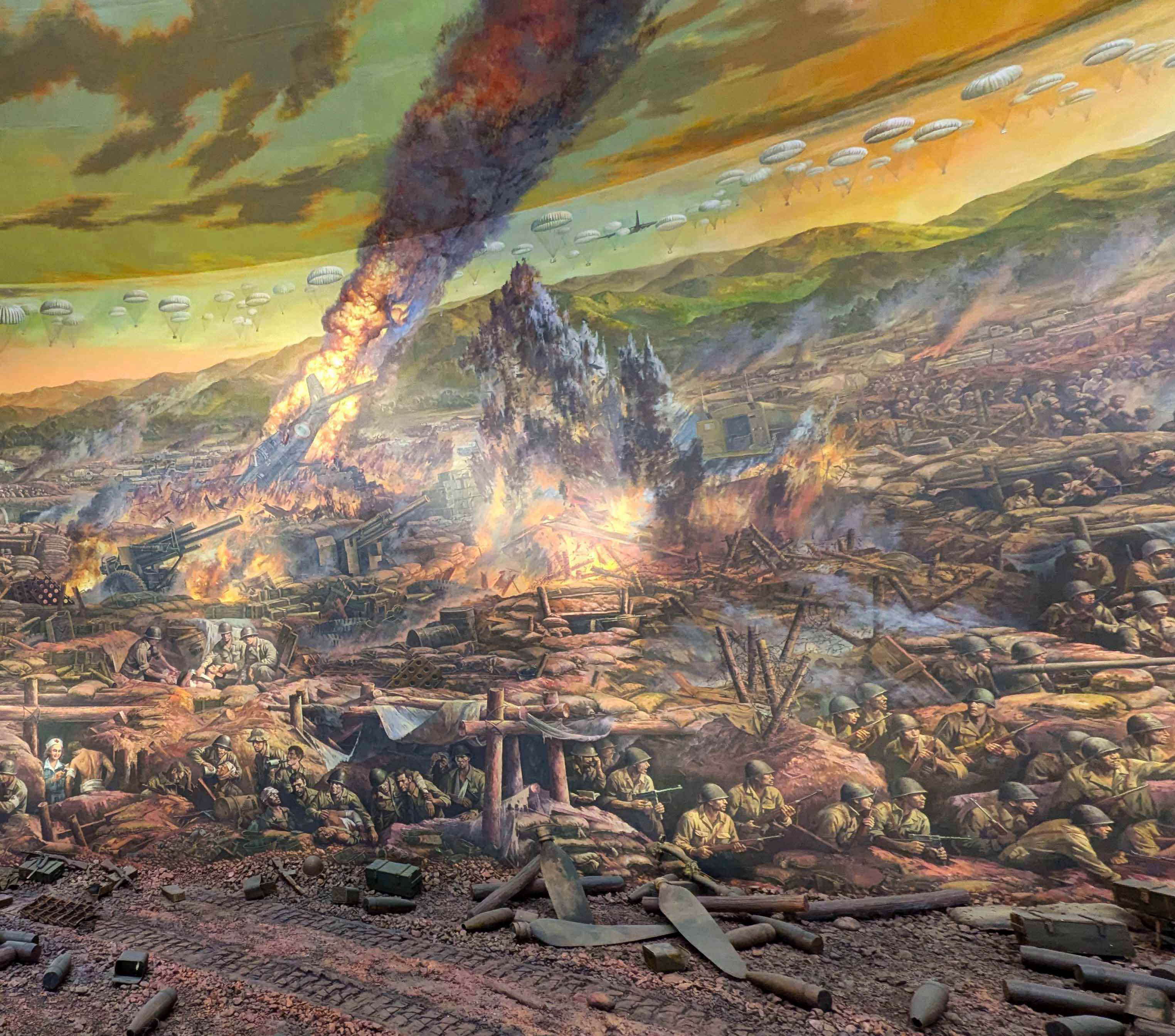 軍用機撃墜など激しい戦闘風景を描いた、博物館の360度バノラマ図の一部