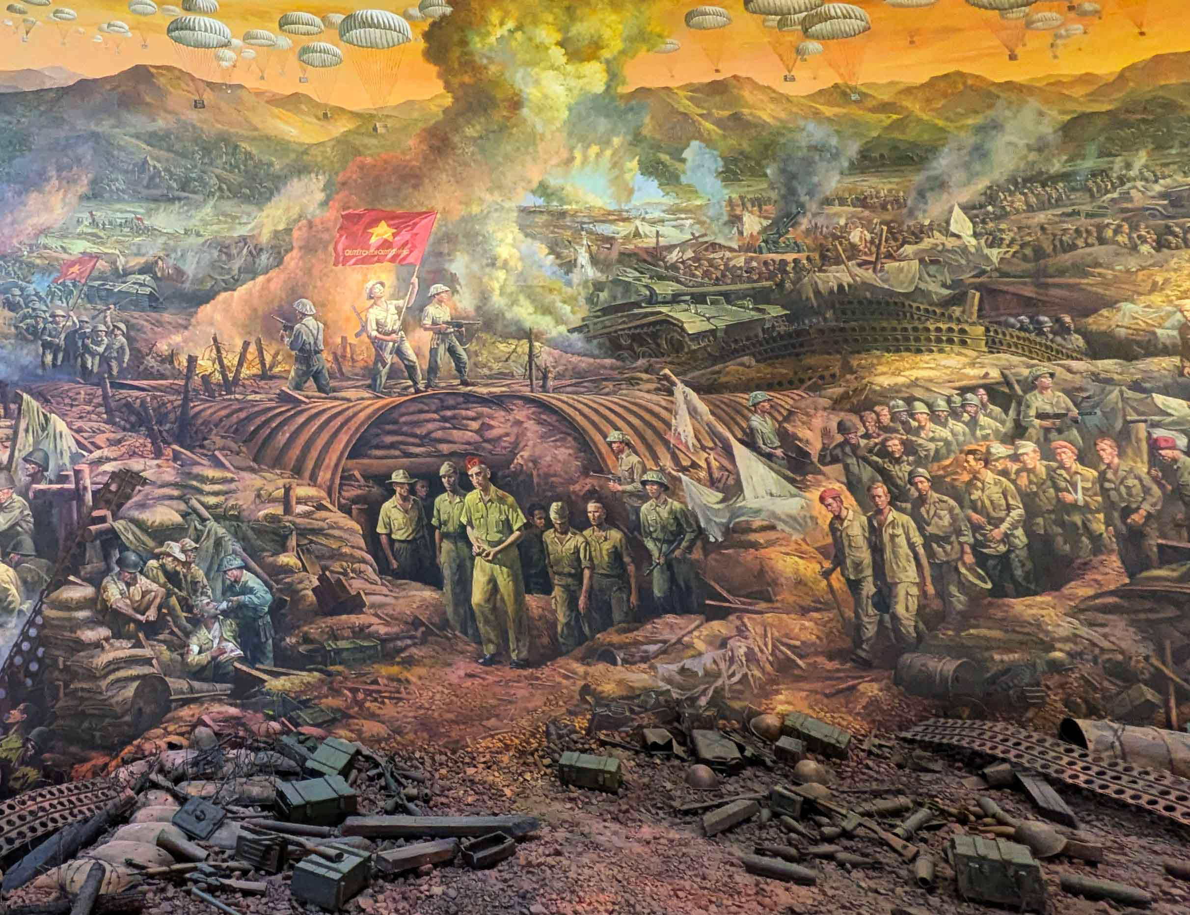 降伏するフランス軍将校たち(博物館のパノラマ絵)と、実際に司令部の上で勝利のベトミン旗を振る兵士