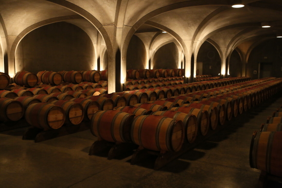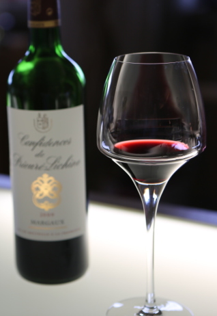 ボルドーのシャトーを巡るツアーもある。右は、そのとき訪問した所の一つ、シャトー・ブリューレ・レシーヌの試飲ワイン。
