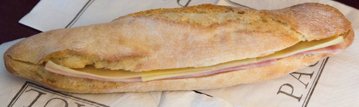 バゲットなどにハムやチーズ、野菜を挟んだものはあちこちで売られている。