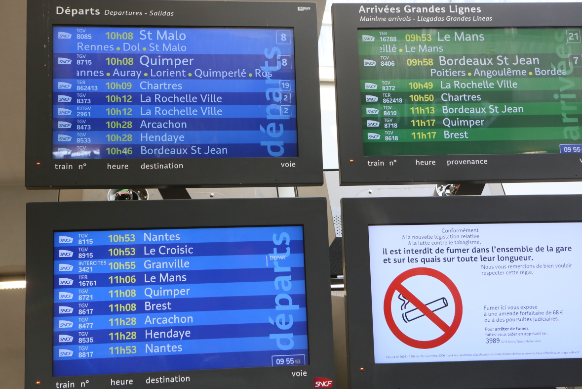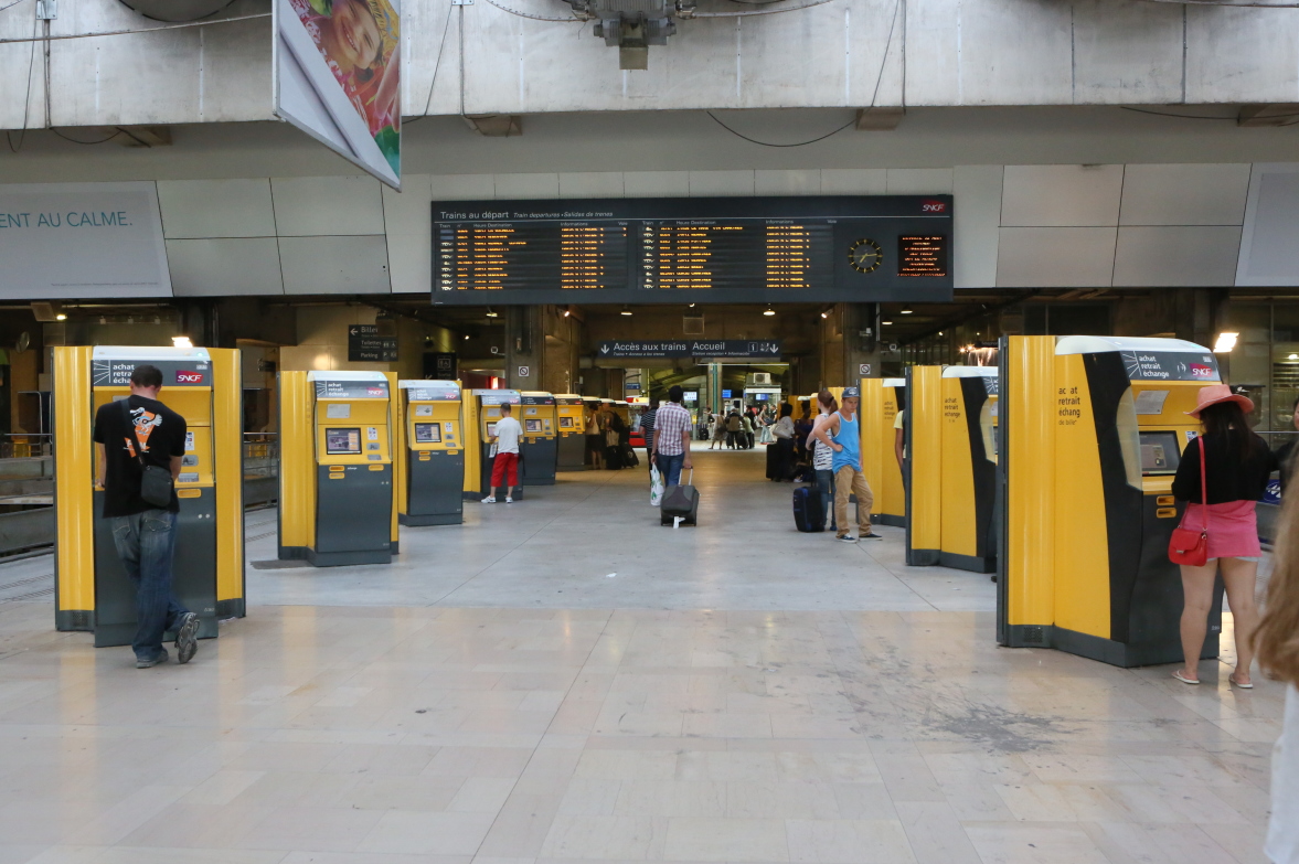 フランスで、鉄道、地下鉄などを利用したが、日本で便利な環境に慣れていると、いらいらすることが多かった。まず、ターミナル駅に列車の1日の時刻表が無い。構内の電気掲示版で直近のを見るか、黄色い切符の自動販売機で目的地を入力して、行き先の列車の時間を検索しなければならない。掲示板に、列車がそれぞれ何番線から出るのか示されるが、早くて発車20分前、遅ければ10分前になっても示されない。