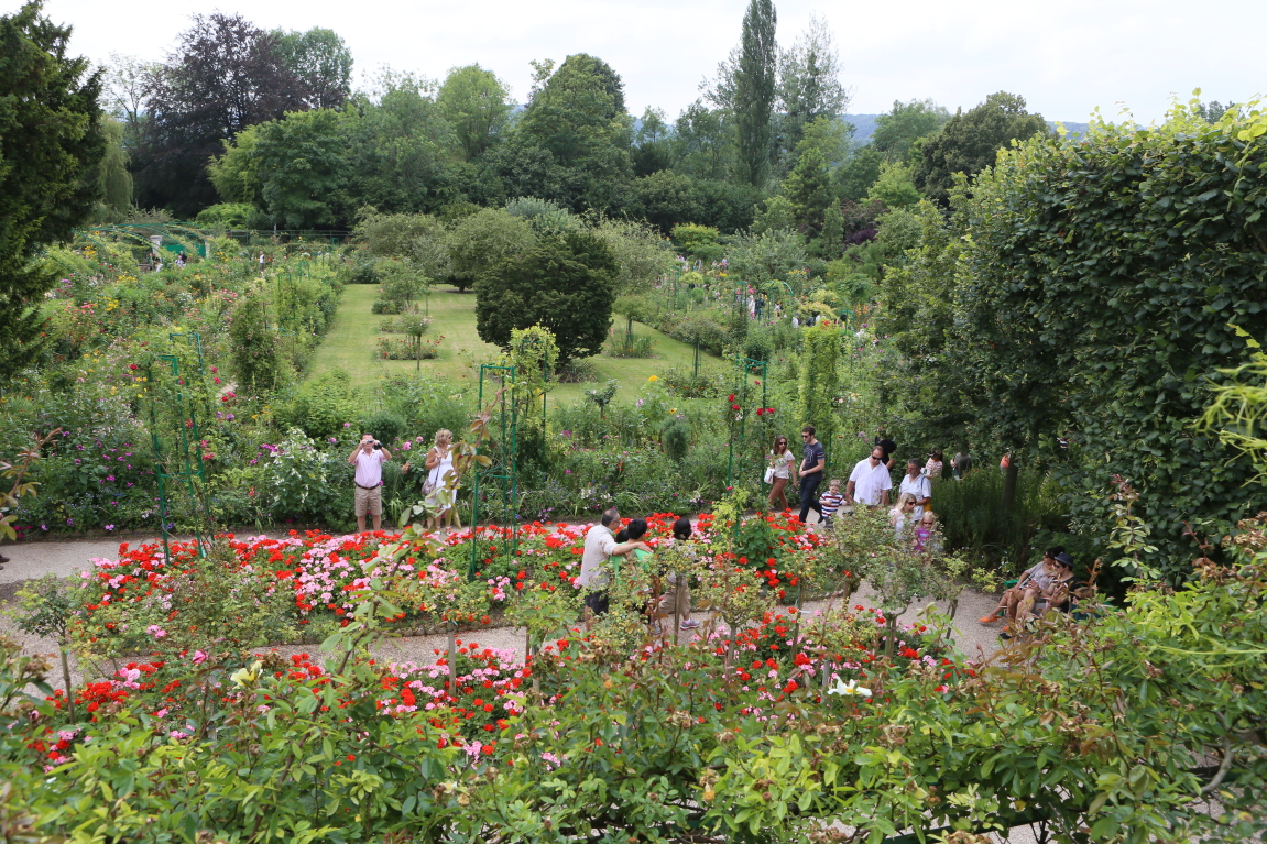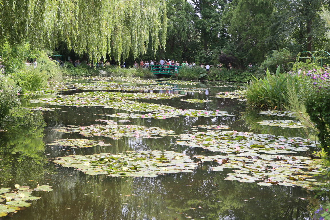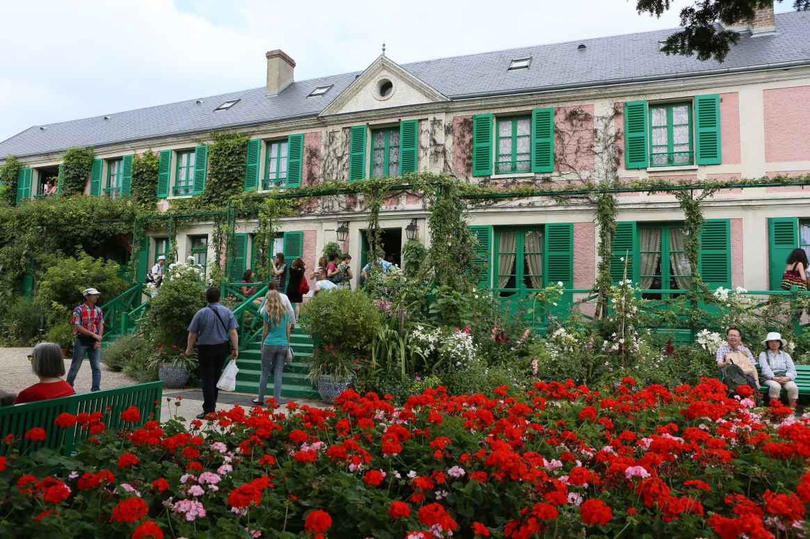 ジヴェルニーはパリから北西へ約70km。「印象・日の出」「ひなげし」「日傘をさす女」などで有名な、印象派画家クロード・モネ(1840-1926)が、42歳から最期まで住み、アトリエ・家を兼ねた建物と自ら設計し手を入れて造ってきた、花や池の庭園が整備され、残っている。家の中は撮影禁止だが、日本の人物浮世絵などが多数掲示されている。モネが浮世絵を愛したことがよくわかる。また、晩年によく描いた睡蓮を育てた池には、日本の太鼓橋を緑色にしたものが架けられている。