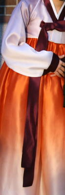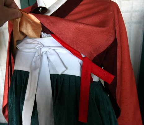 普通韓国で見るチマチョゴリは左のようなものだけれど、「大長今」の女性たちが皆着ているものは前に白い紐のようなものを垂らしている。「大長今」テーマパークでやっとこの謎が解けた。ガイドによれば、現在のチマも白いものがついているが出さないとのこと。時代による着方、流行があるとのこと。