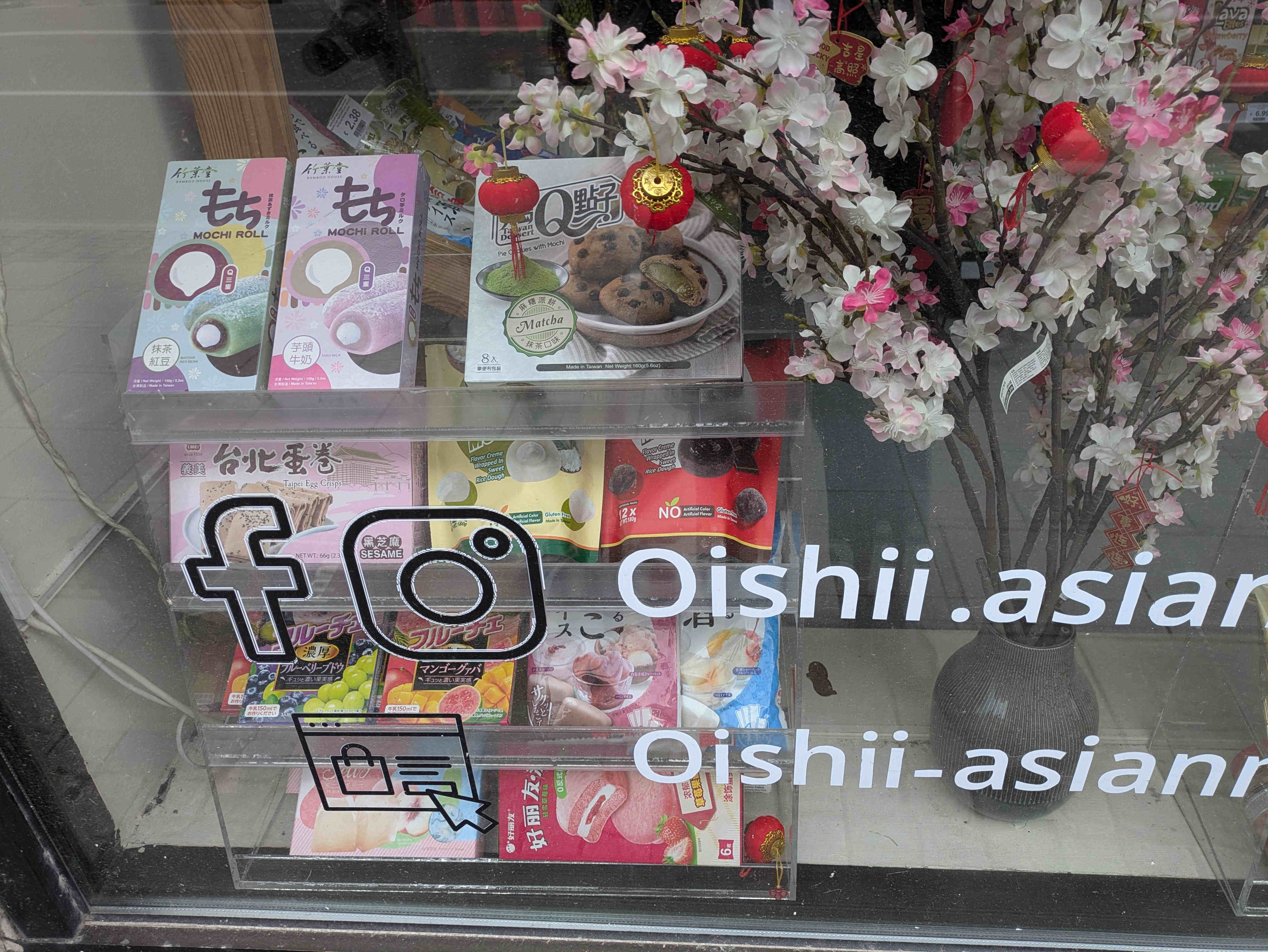 右の店のものは、台湾のお菓子と一緒に売られていました。脇の飾りが日本と中国の文化融合です。