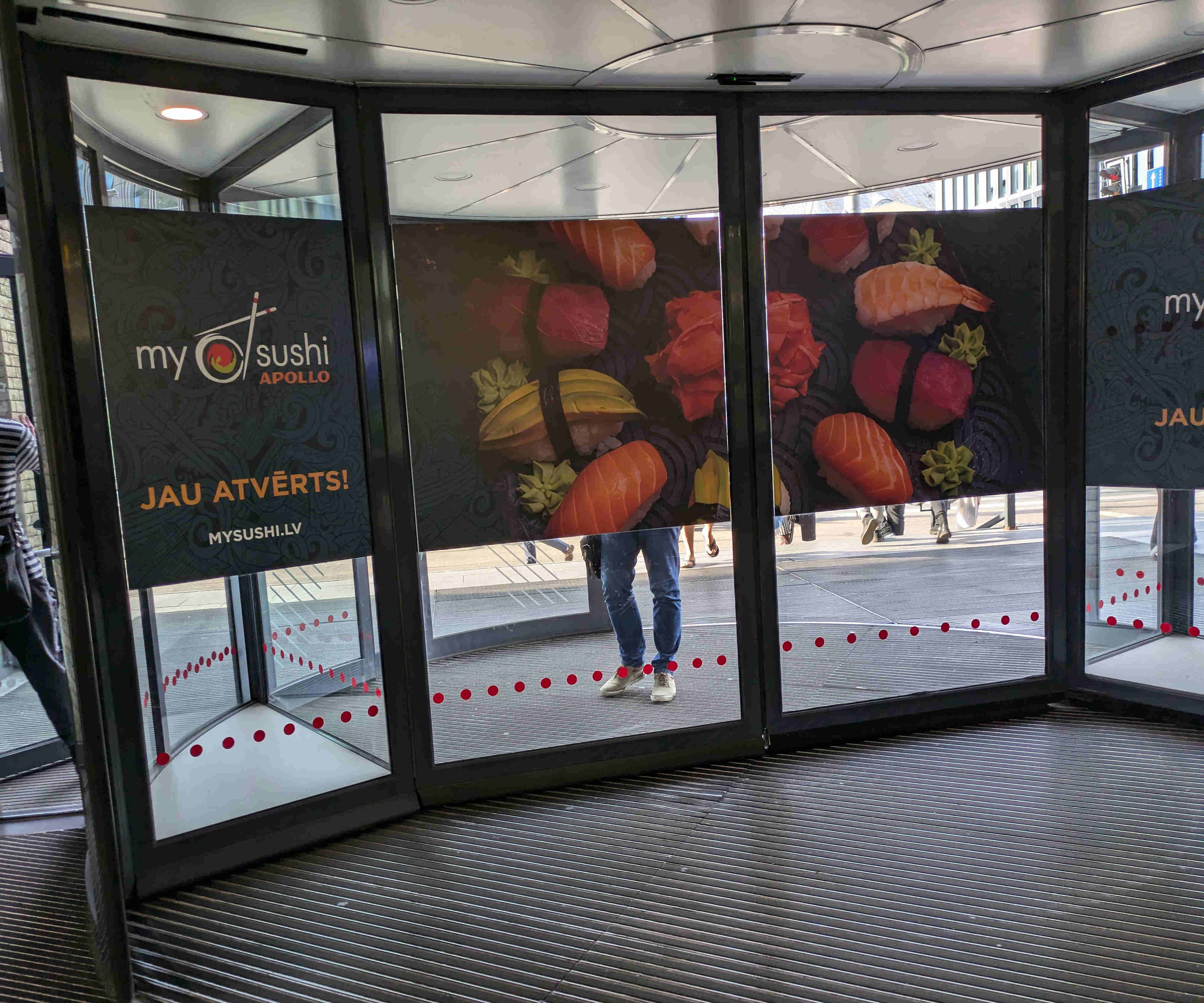 リガ鉄道駅の入口の回転ドアに「sushi」の文字と写真がありました。見た感じはまともそうです。 毎日列車で通勤する人はsushiの名前とイメージを持つことになるわけです。この「my sushi」のサイトを見ると店の歴史が書いてあり、初めはエストニアのアパートで調理しての宅配サービスから始まり、やがてレストラン店舗を構え、リガにも進出したチェーン店の様です。ただし、駅中のスーパーに、この写真とは違う、この店のものかどうかは不明ですが、「Sushi」のセットを売っていて、マヨネーズも入っているようですし、スペインで食べたSushiが、とても硬いご飯で、おまけに酢飯とは言えないものだったので、ラトビアではいっさい口にしませんでした。そのSushiを食べたラトヴィアの人々が、「こんなものなのか」と本場日本の寿司を誤解しないか心配です。