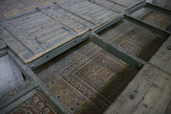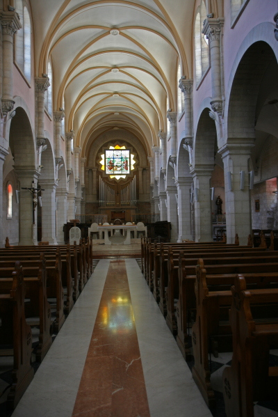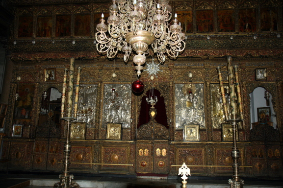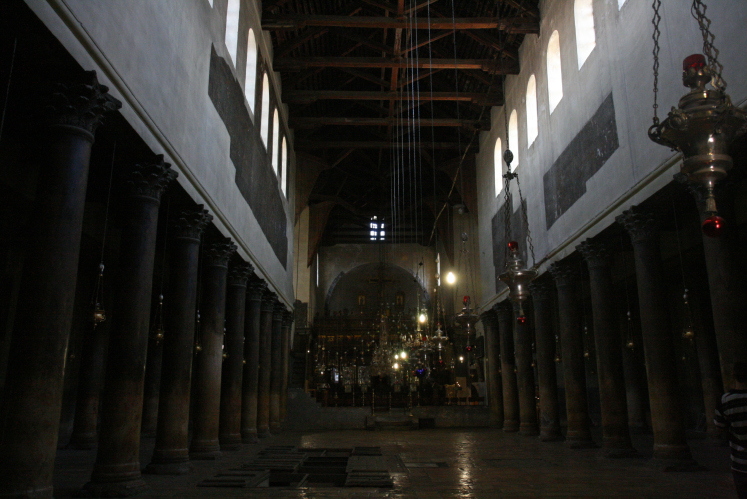 バシリカの内部は左右2列の柱列。中央の祭壇はギリシャ正教の管轄で、その床下にイエスの誕生の地がある。