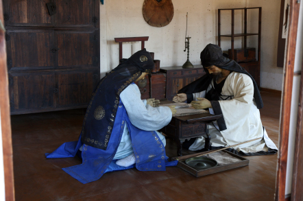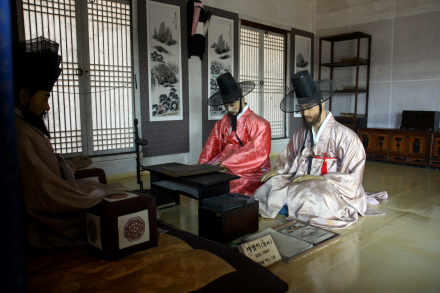 両班たちのさまざまな生活が等身大の人形で再現されている。右は子供に学問を教えているところ。その下は客と宴会か?