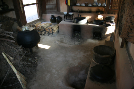 村の入り口には、魔除けの石や、これも魔除けで有名な「天下大将軍」と「地下大将軍」がある。ここには各地から集められたものが屋外展示されている。 神を呼ぶため、五行説に基づいて青(木)、赤(火)、黄(土)、白(金)、黒(水)の布を結んだ木。チャングムとハン尚宮が宮廷の味噌が悪くなった原因を探るため、ある村で村人が味噌のできを神に祈るのを見るシーンにこれがあった。右が実際に撮影で使われた木。