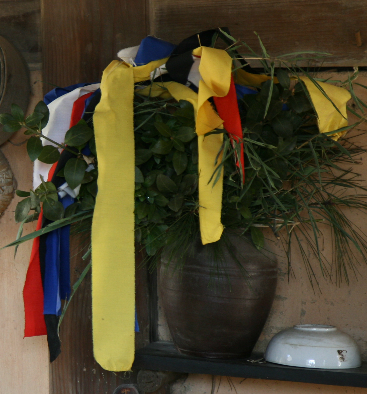 この展示されている農家の入り口には、子供が生まれたことを示すとともに、悪い気が入らないよう、来客の遠慮を願う注連縄のようなものが掛かっていた。赤唐辛子が挿してあるのは男子誕生を示す。