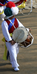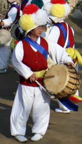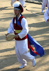 ケンガリ(小金)・チャング(杖鼓)・プク(鼓)・チン(銅鑼)からなるサムル(「四つの楽器」)を演奏しつつ、激しく踊るパングッにソゴチョム(小鼓舞い)を併せたようなものだ。また、ラッパも加わっていた。全部で約20人。多くの人が頭にサンモという長い白い紐をつけた帽子を被り、首を振り、反り返り回転しながら新体操リボンのようにサンモを回す激しい踊りである。