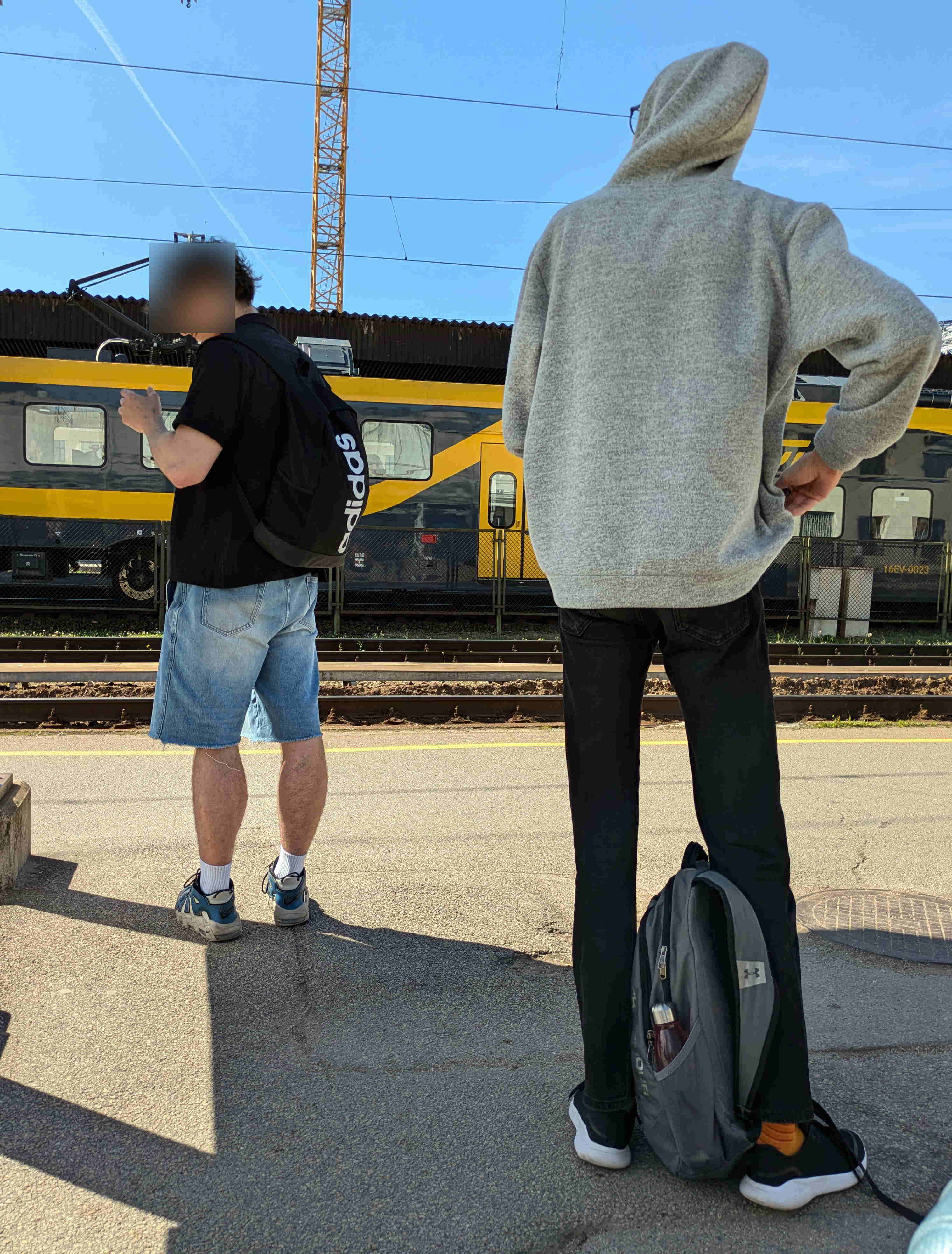 (左)リガの街角にて。手前の女性は手に着ていたジャケットを持ち半袖になっていて、向こう側の、信号待ちの男性は腰にジャケットを巻いている。(右)11時のリガ駅。寒さから温かさへの移行時点。