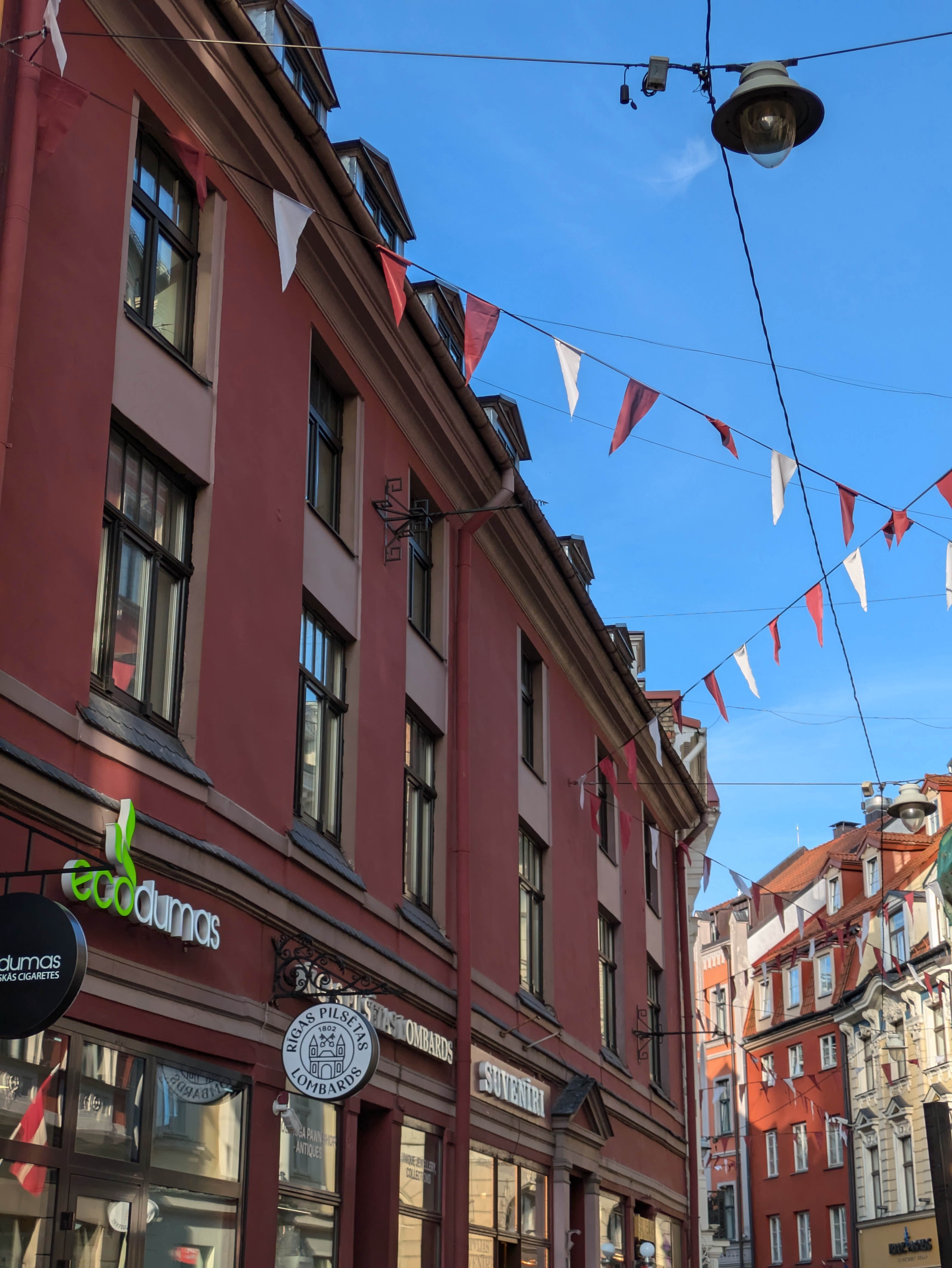 リガの街中をよく見ると、この二つの色の組合せが様々な形で使われていました。