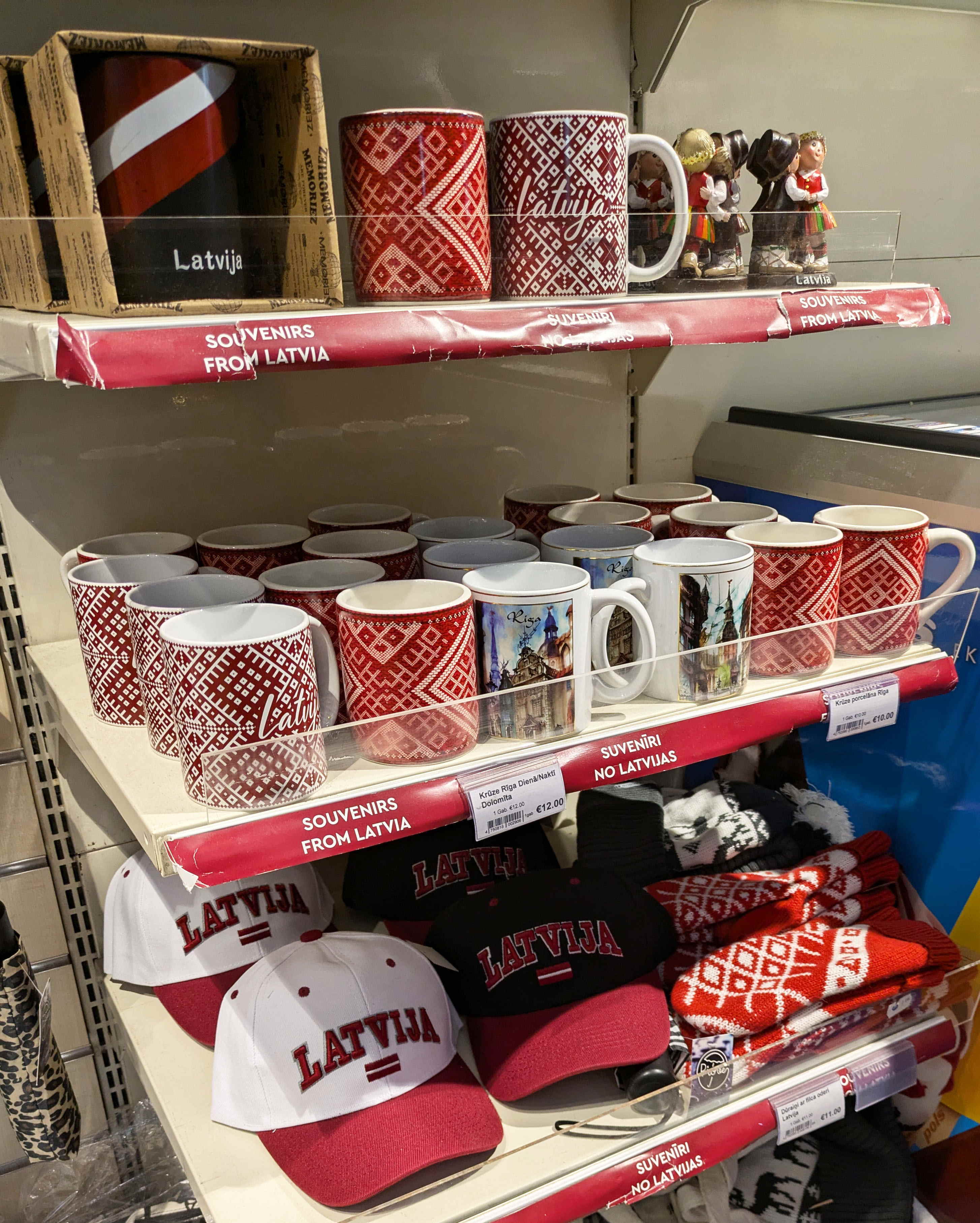 私が「ラトヴィアのシンボルマークの一つ」と言ったものや、それに近いをデザインを使ったものは、衣類以外にも見られました。ダウガバ川の遊覧船の外壁のデザインや、リガ空港免税店で売っていたマグカップのデザインなどです。1回だけ、街中を走っている市電の外壁がこの船のようになっているものに出くわし、感動して撮ろうとしたところ、カメラを取り出すのにもたもたして、残念ながらシャッターチャンスを逃してしまいました。リガ滞在の終わりのころでしたので、二度とお目にかかれませんでした。