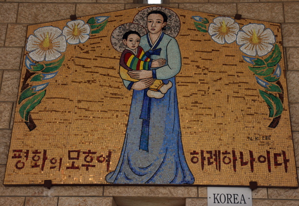 教会の外側や、内部には各国のカトリック教会から贈られたマリア像があり、それぞれの民族衣装を着ていて見ていて楽しい。
