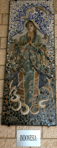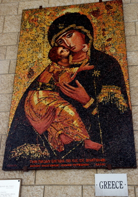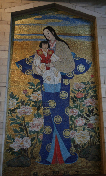 日本からは長谷川ルカ作「華の聖母子」像。細川ガラシャ夫人(明智光秀の娘「たま」。細川忠興の妻でキリスト教に入信。関が原の戦いに際して夫が徳川に付き、石田方から人質にされるのを拒んで自害せず家臣に死なせてもらう)のイメージ。着物の袖は真珠で飾られている。