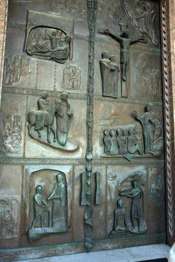 入り口の扉には、イエスの誕生、マリア、ヨセフのエジプト行き、イエスのヨセフの手伝い、ヨハネによるイエスの洗礼、イエスの垂訓、十字架上の死という、聖書の話が刻まれている。