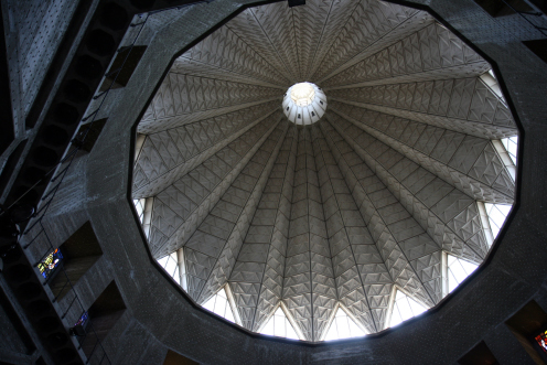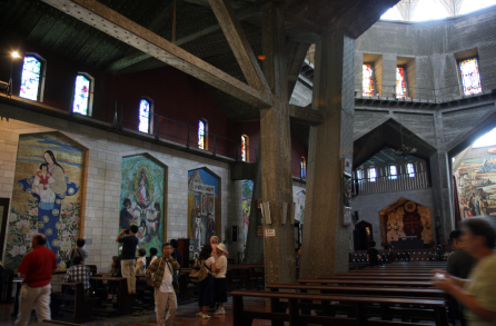 教会の屋根は「天の女王マリア」の王冠を模し、その内部は純潔を示す百合の花をモチーフにしている。マリアのMやAもデザインされている。