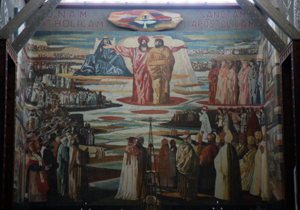 2階正面には、カトリックの教義である、神(目)、イエス、精霊(鳩)の三位一体と、天の女王マリアの図がある。
