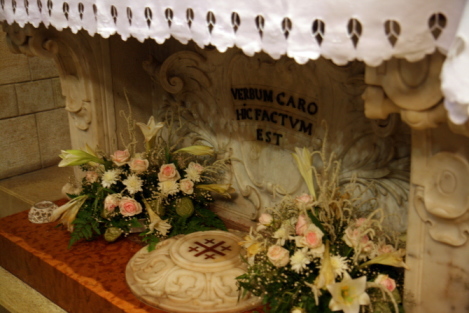 洞窟の中に聖なる地を示す場所がある。“VERBUM CARO HIC FACTUM EST”とは、「(受胎告知の)みことばはここで人となり」というラテン語で、赤い大きな十字のまわりに4つの小さな十字を配したフランシスコ会の十字があるところで、マリアが精霊によって神の子をみごもった場所だとされている。多くの人々がここに触り、祈っていた。