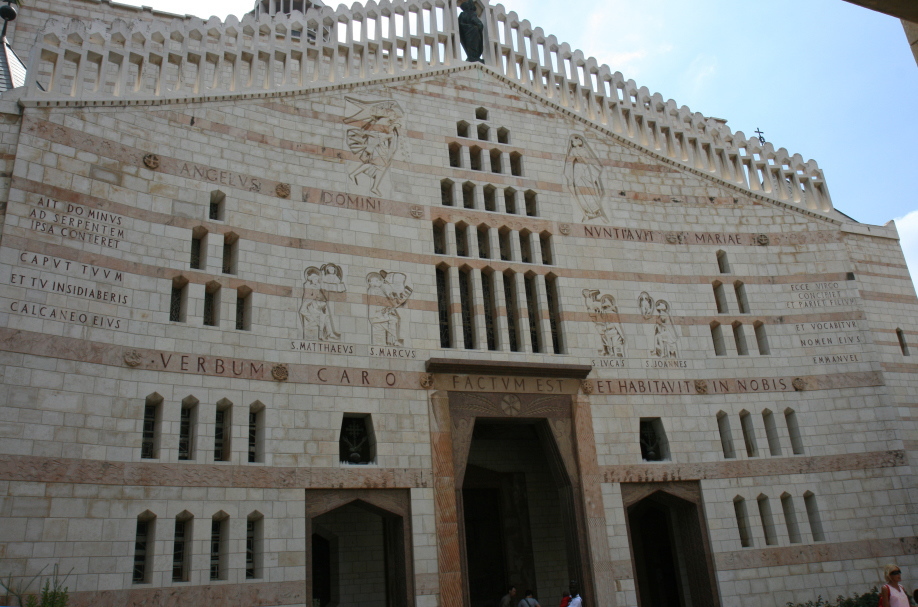 356年に、ローマ帝国のコンスタンティヌス帝の母エレナにより最初の教会が建てられ、その遺跡の上に427年にビザンチン教会が建てられ、12世紀にはその廃墟の上に十字軍の教会が建てられ、それが1263年にトルコ軍によって壊されずっと廃墟のままだった。17世紀にカトリックのフランシスコ会がここに来て教会を作り、1969年に全く新しい現在の教会がフランシスコ会により建てられたという重層的な歴史をもつ。大きな教会で、中庭からは28mm広角でも全体を撮りきれない。