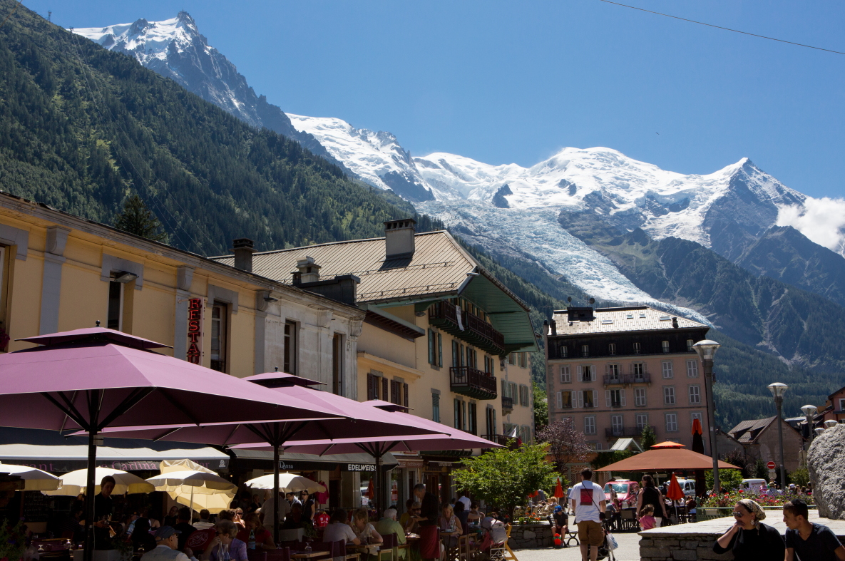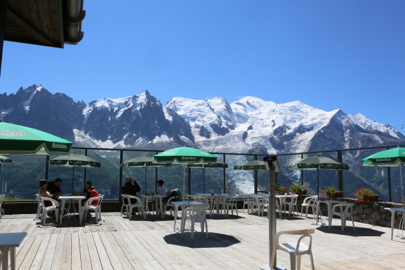 シャモニのカフェで、ビール、コーヒーを飲みながらモンブラン鑑賞。どれがモンブランかわかりますか?