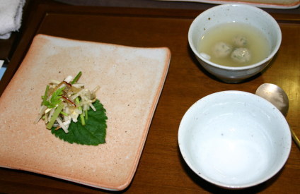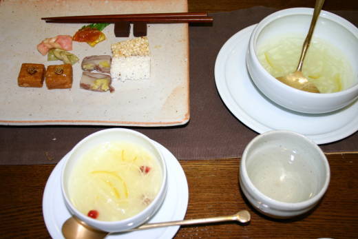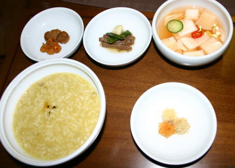 「二味」として出てきたのは、鱈の皮と大根と芹の酢の物、韮と魚の団子スープ、そして牛乳ともち米のお粥(宮中に上がった幼いチャングムがヨンセンと退膳間(テソンカン)に忍び込み、ひっくり返してしまった王の夜食)。おいしいので気がついたらお粥をほとんど食べていた。あわてて写真をとったのがこれ。