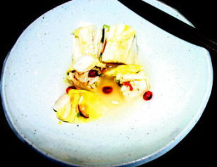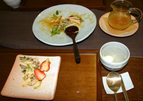 「三味」は、柿汁に酢を入れたドレッシングの、筍、芹、苺、椎茸、もやし、牛肉の和え物。