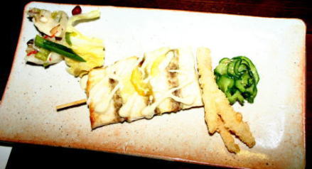 「進御小膳・魚膳」として出されたのは、白菜、大根、ねぎ、椎茸、松の実、石榴の水キムチで塩、生姜、ニンニクで味付けしたもの。また、鱸を蒸して串刺したものに甘い柚子を伐ったものを載せ、辛味のソースを掛けたものがメインの魚料理。「芥子マヨネーズですか?」と聞いたら、「松の実ソースですよ。」と笑われてしまった。さらに、生朝鮮人参の揚げ物とゆで胡瓜をゴマで和えたもの付き。