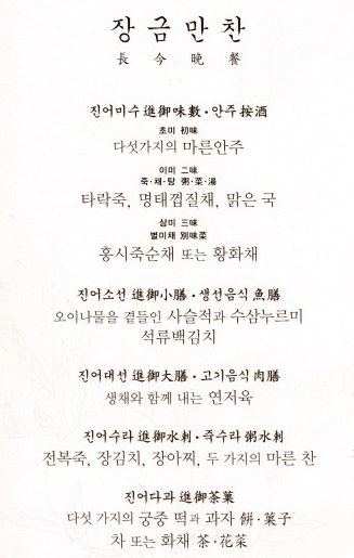 ソウルの景福宮の北、鍾路区嘉会洞に2005年12月にオープンした「宮宴(クンヨン)」という宮廷料理店がある。ここは、テレビドラマ「大長今」の料理諮問をしたハン・ボッリョさんが主宰する店で、メニューの中に「長今晩餐」という長今(チャングム)ゆかりの料理が味わえるコースがある。ハンさんは、重要無形文化財候補の人。現在の韓国料理に不可欠の唐辛子は、アメリカ大陸原産のものでチャングムの生きていた16世紀最初にはまだ朝鮮半島にはもたらされていなかった。唐辛子を使わない宮廷料理にはとても魅力を感じる。この店の情報を得て、「チャングムおたく」の私は「どんなに高くても食べる」とここに行くのを即断した。前日予約した方がよく、2人からである。以下はその経験である。