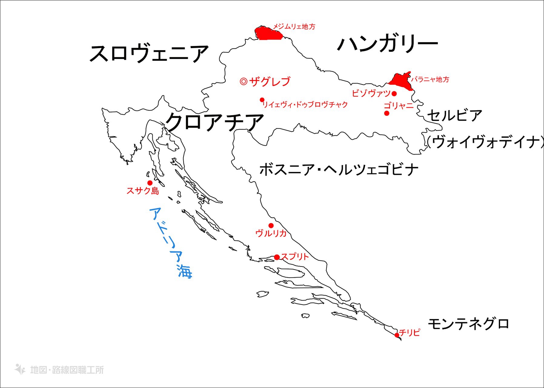 クロアチアの例示した衣装の地域を示す地図(筆者作成)