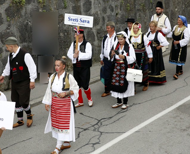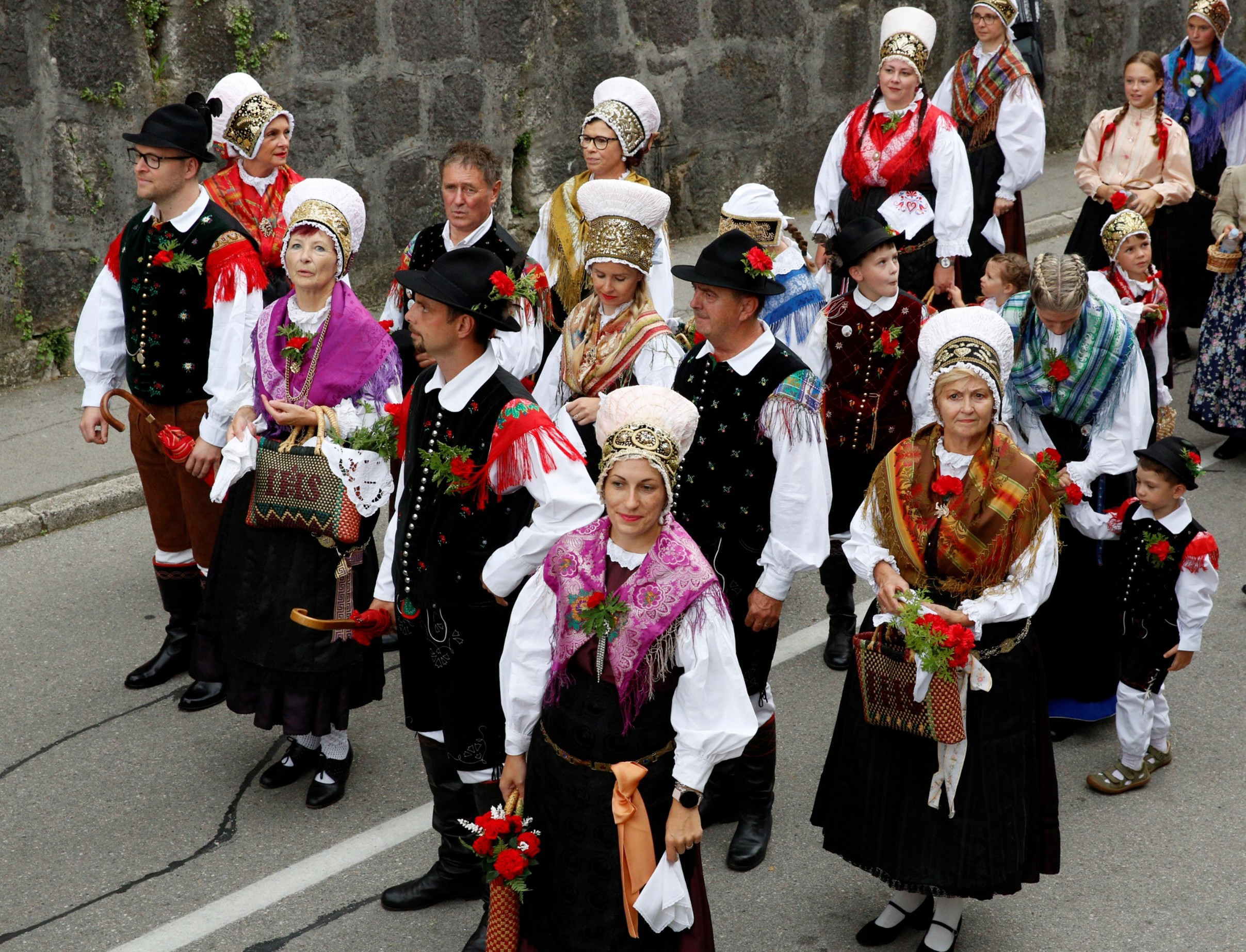 「これは古くからの習わしで、スラヴォニア地方の・・他の村々でも守られてきましたが、ゴルヤニでは1966年に途絶え、2002年に復活して以来、▲聖霊降臨祭の日(▲キリスト教において、イエスの復活後、弟子たちに聖霊が降ったことを記念する日で復活祭から50日目の日曜日にあてる。 聖霊が降ったとき、弟子たちの頭上に炎のようなものが現れ、弟子たちは突然、自分たちが知らないはずの多くの外国語で語り始めた。その場にいた多くの民族の人々が、自分の母語で弟子たちの言葉を理解できるようになった。すなわち、弟子たちが神の力によって言語の壁を超え、世界中に神の教えを布教できるようになった日とされる。 私注)に毎年行われています。トルコによるゴルヤニ侵攻の時代にまつわる地元の伝説によれば、トルコ軍が村のすべての男性を捕らえた後、村の女性たちは男性の服を着て、男性用の帽子をかぶり、手に鎌や草刈り鎌を持ってトルコの陣営へ向かいました。トルコ兵たちは彼女たちを見て幽霊だと思い込み、恐れて逃げ出し、女性たちは村の男性を解放したのです。現在では、Ljelje(女王たち)は鎌や草刈り鎌の代わりにサーベル(湾曲した剣)を手にし、色とりどりの模様と細部に富んだ独特の民族衣装を身にまとい、頭には高く豪華に飾られた帽子をかぶっています。★今年(★2023年。私注)の春の行列には10人のLjeljeが参加し、村の巡行はゴルヤニの聖ヤコブ使徒教会でのミサから始まりました。Ljeljeは歓迎される客人であり、彼女たちを自宅や庭に迎えることは大きな名誉とされています。彼女たちは、扉を大きく開けて招かれるのです。」