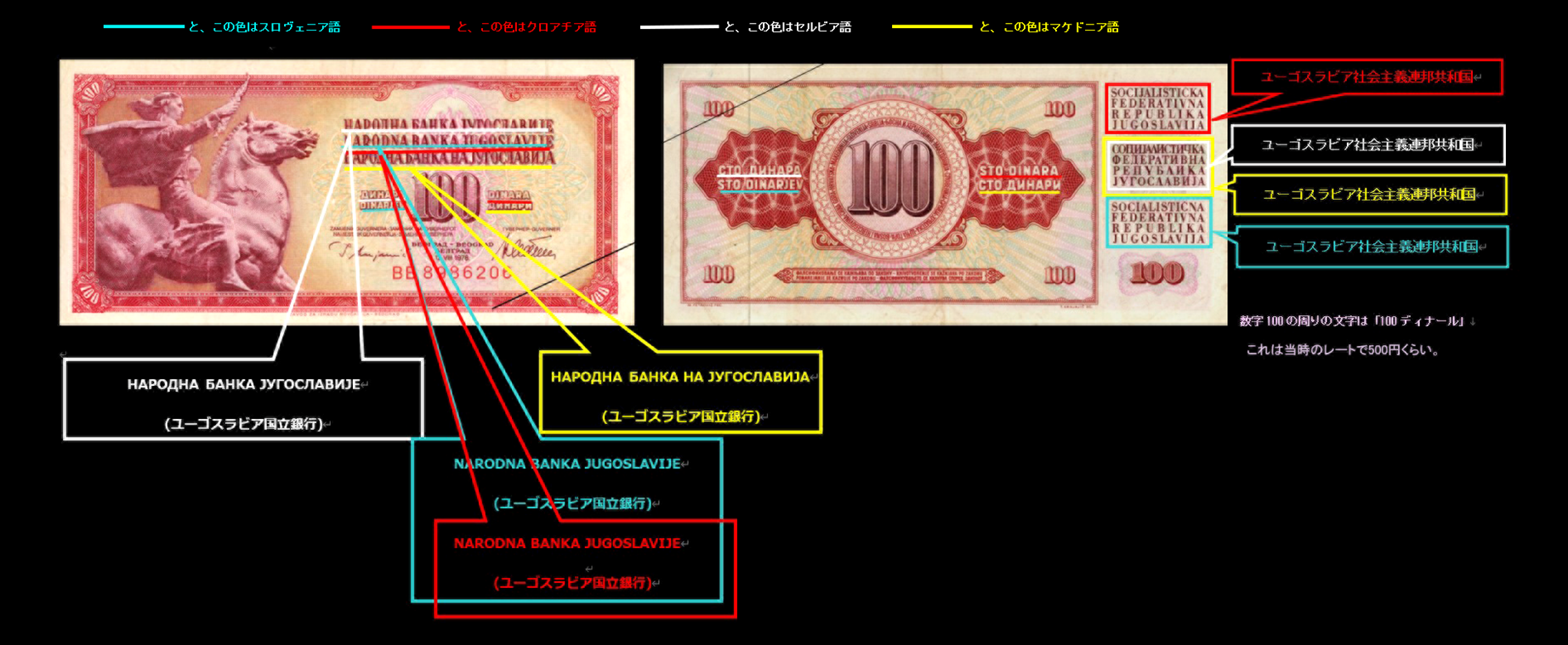 四つの言語、二つの文字については、1982年当時国中で出回っていて、私が持ち帰っていた旧ユーゴスラビア国立銀行の紙幣がよく示している。また、紙幣の発行元が「ユーゴスラビア国立銀行」なのは「一つの国」を示している。