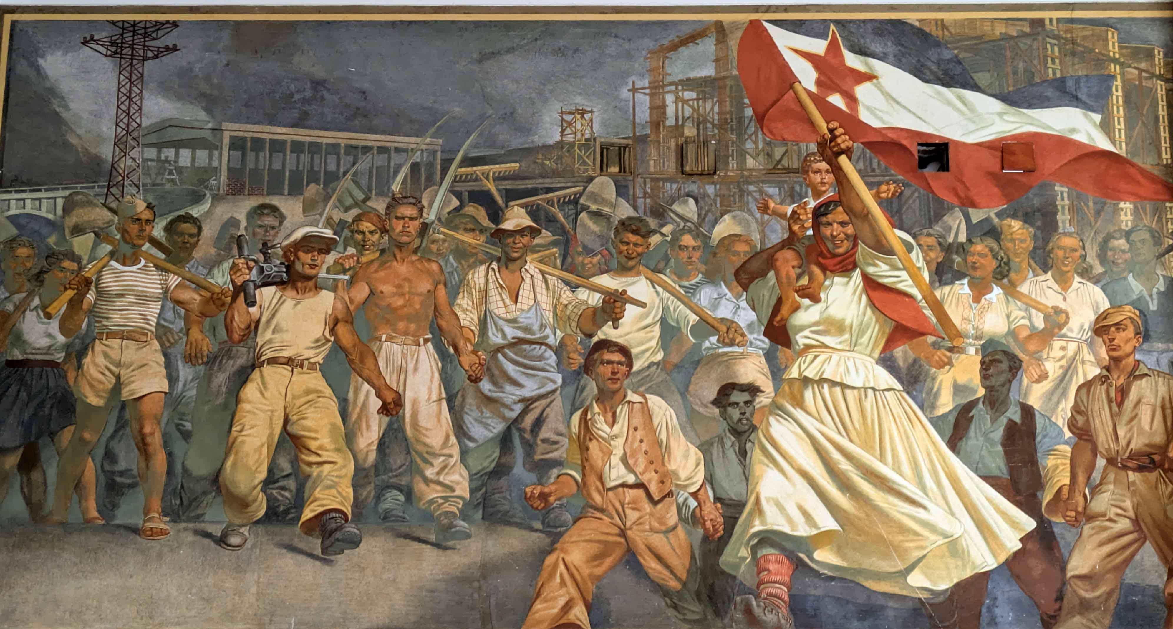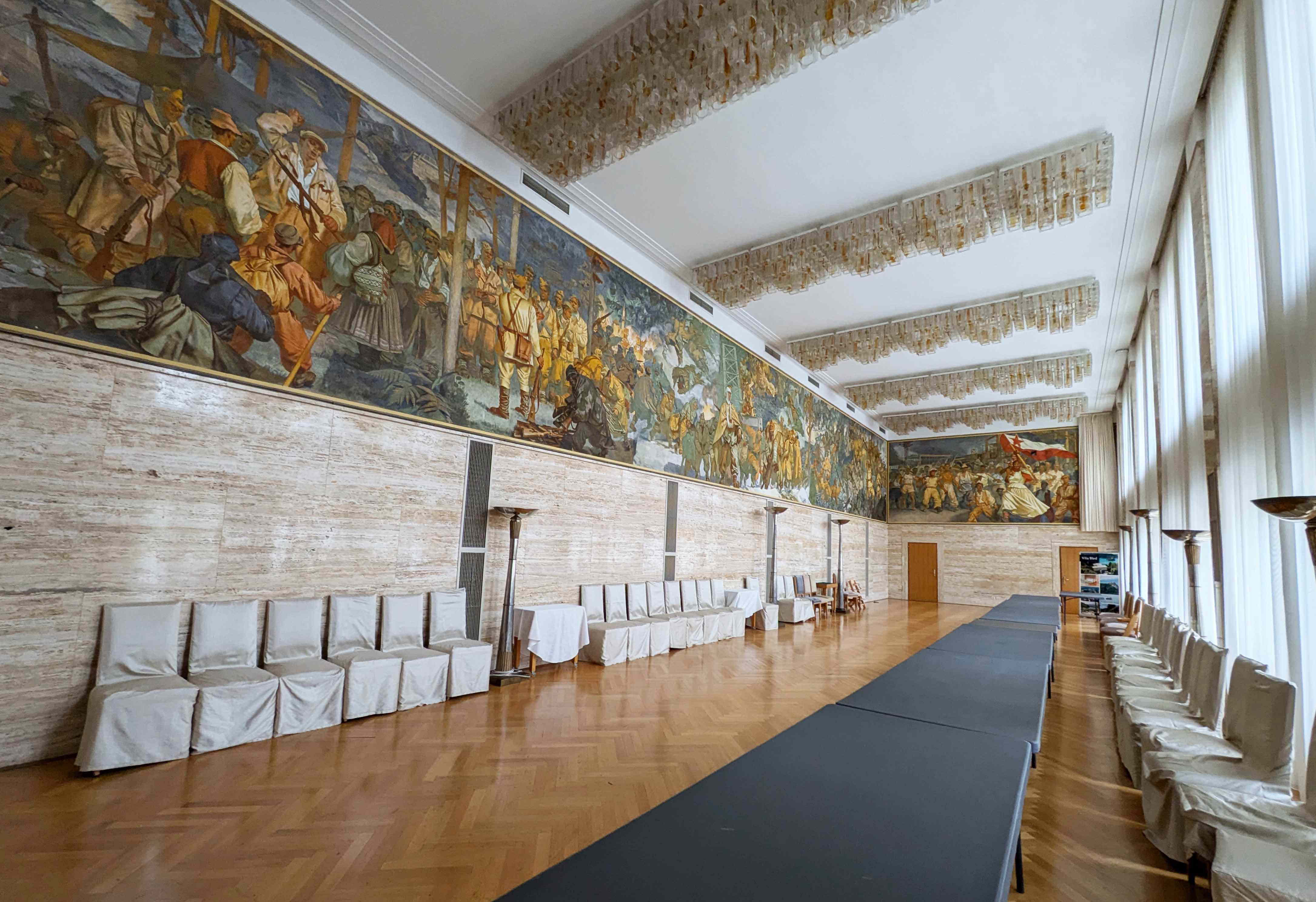 1階には、チトーのためのレセプションホール、映画館を兼ねていたホールが現存する。壁にはスラブコ・ペンゴフが1947年に描いた壁画がある。ユーゴスラヴィアにおける第二次世界大戦の始まりから解放までを描いている。また、奥の壁画は、ユーゴスラビアの「社会主義国家」としてのイメージを描いている。(上記サイトの説明より)