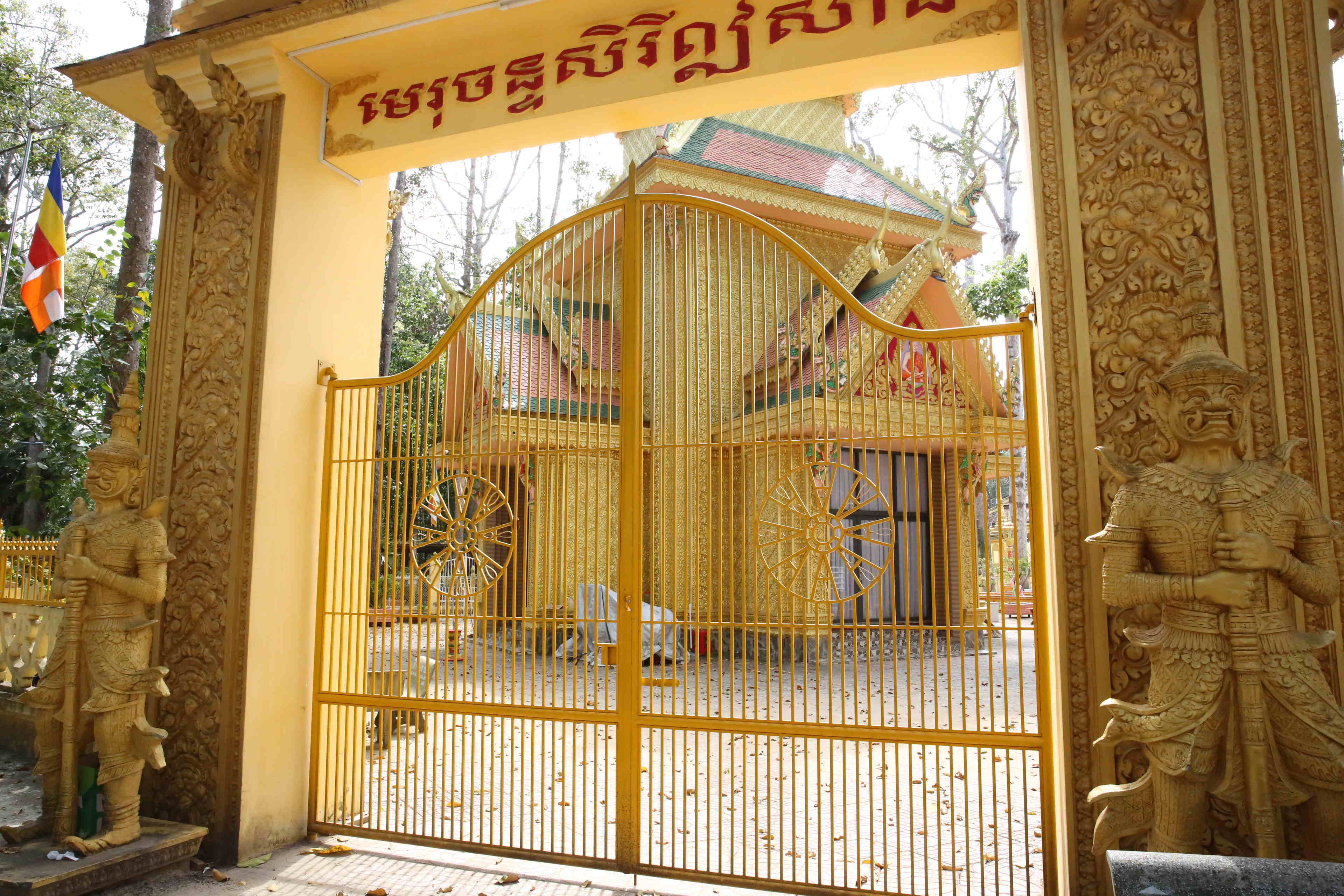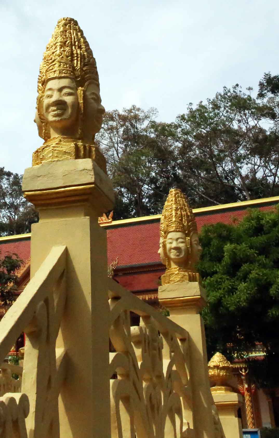 入口の一つに、タイの寺院でも見られた守護神ヤック像。寺院の建物の屋根にはガルーダとナーガも。