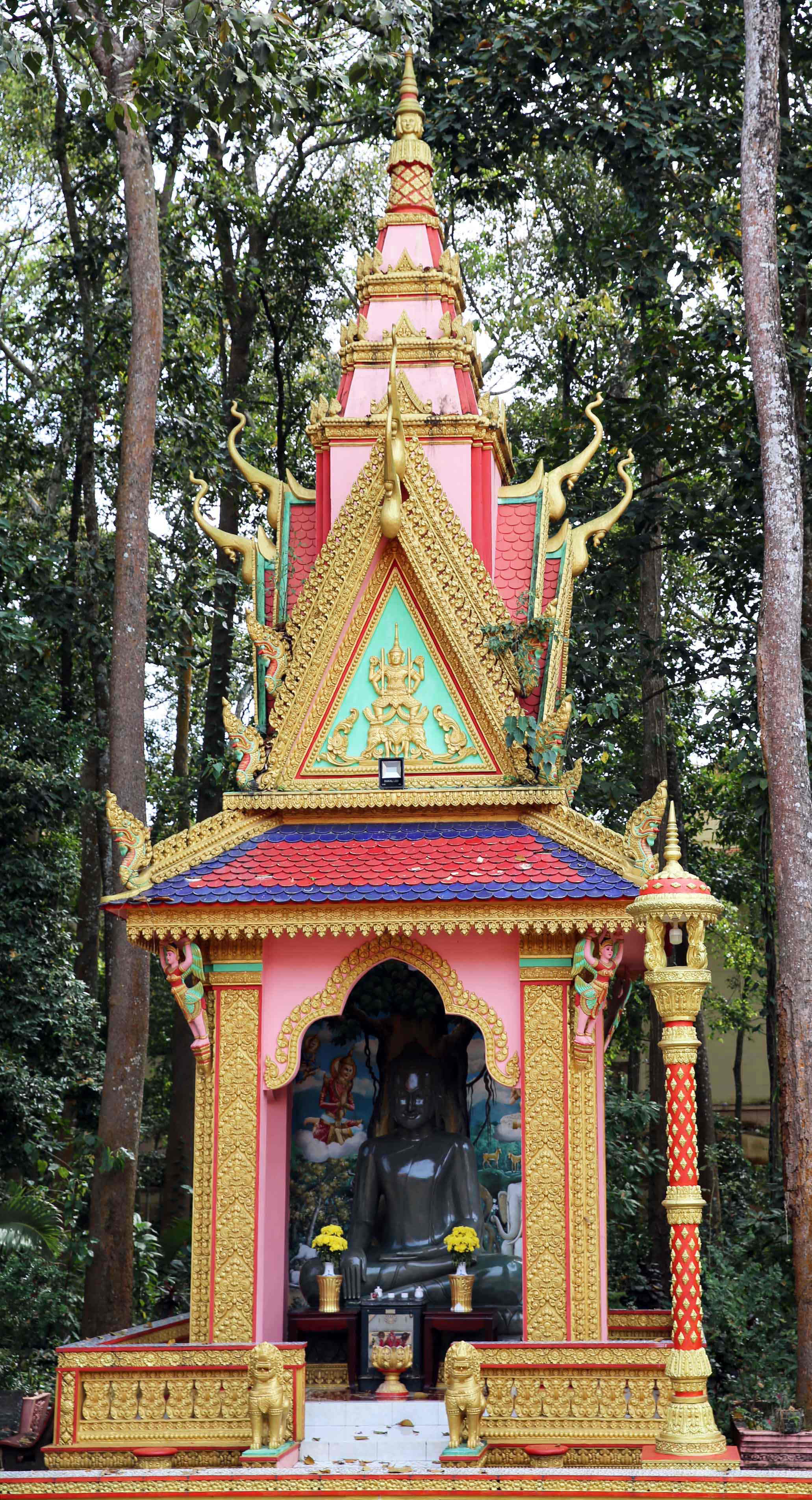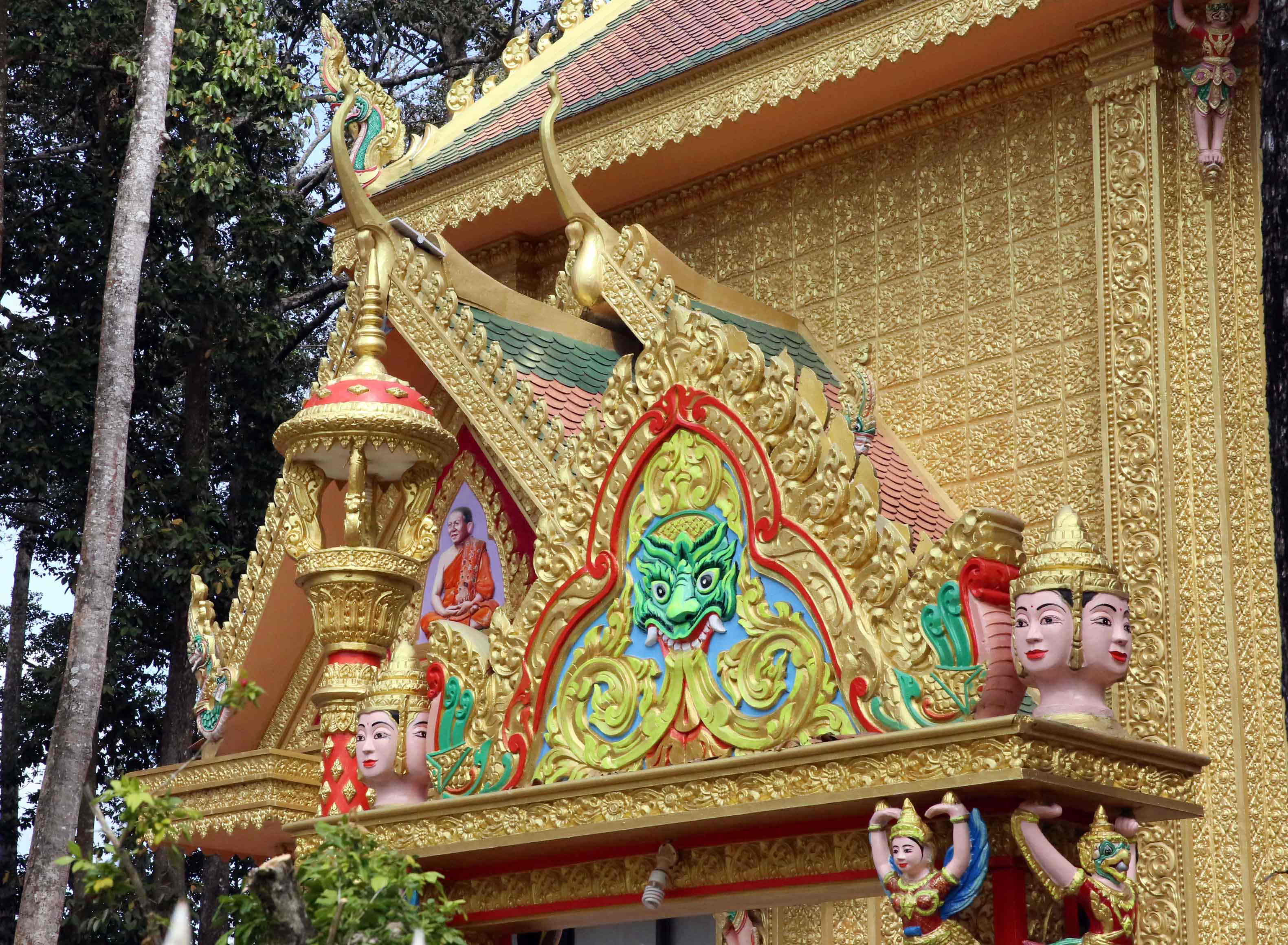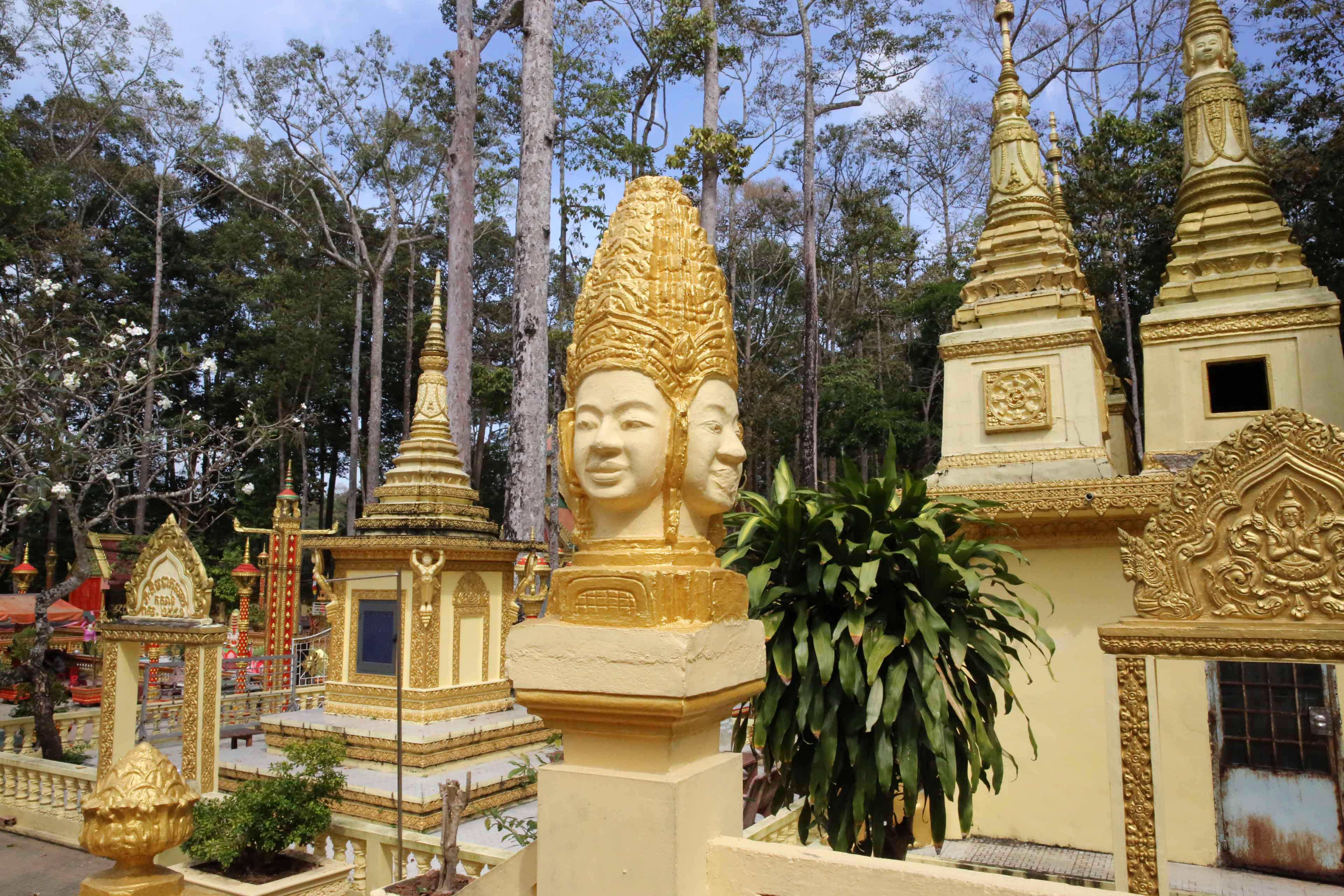 ここのアン寺院(Angkorajaborey 「王都の栄光の寺」建立990年)というところに行った。タイで見た上座部仏教寺院に雰囲気がよく似ていたが、装飾のあちこちに人面を使っていて、タイの寺院とは明らかな違いを認識した。帰国してから調べて驚いたのは、この寺院だけでなく、クメールの上座部仏教寺院は、その人面のデザイン、モデルの一つに観音菩薩を使っているということ。私の見たものは「観音+王」像の人面だったが。上座部仏教では、仏は釈迦のみという信仰で、また仏になる修行をする菩薩と言う概念自体を否定すると理解していたためである。釈迦のみが仏なので、どう修行をしても仏陀にはなれないという理念だ、と理解していた。様々なクメール上座部仏教についての書やサイトを見ると、1200年、クメール王国の王だったジャヤバルマン7世が、それまでのアンコールワットに見られるようなヒンドゥー教信仰を転換し、大乗仏教に帰依し、バイヨン寺院などを建立し、慈悲の象徴である観音菩薩を四面に刻んだものを建てた。そして、14世紀にクメールは上座部仏教にまた改宗したが、この観音像などの人面を寺院内に多く立てる様式を続けたということである。大乗仏教の国、ベトナムに来て、このような異文化に触れ、自分の見識が深まって良かったと思った。なお、GoogleMapsで近辺の別の寺院の写真もいくつも見たが、皆このような人面像を立てている。それから、後で示すが、ベトナム戦争当時、この仏教の中には解放戦線に協力した勢力があったため、現在のベトナム共産党当局は、このような立派な寺院が存立することを認めているのだと思う。