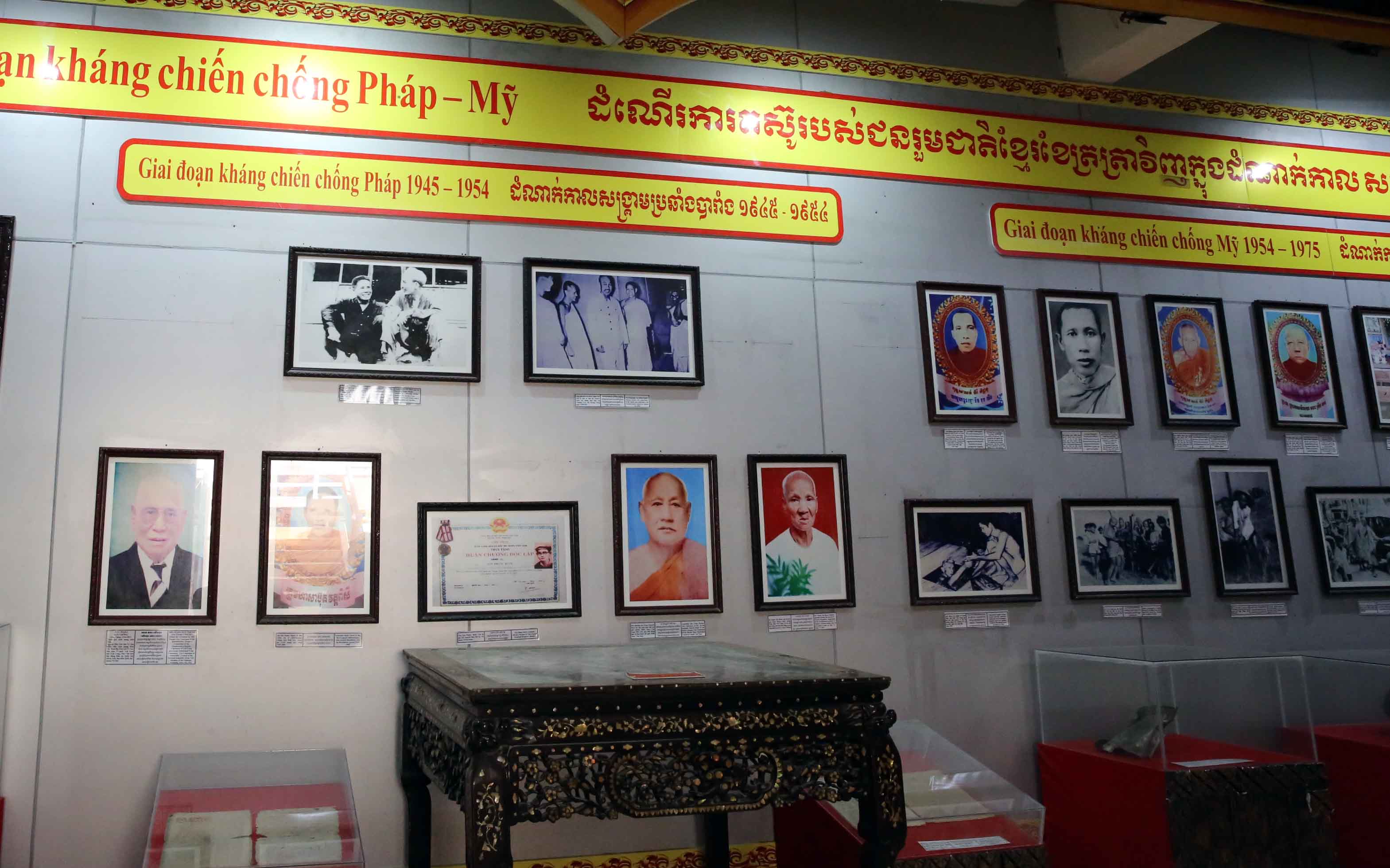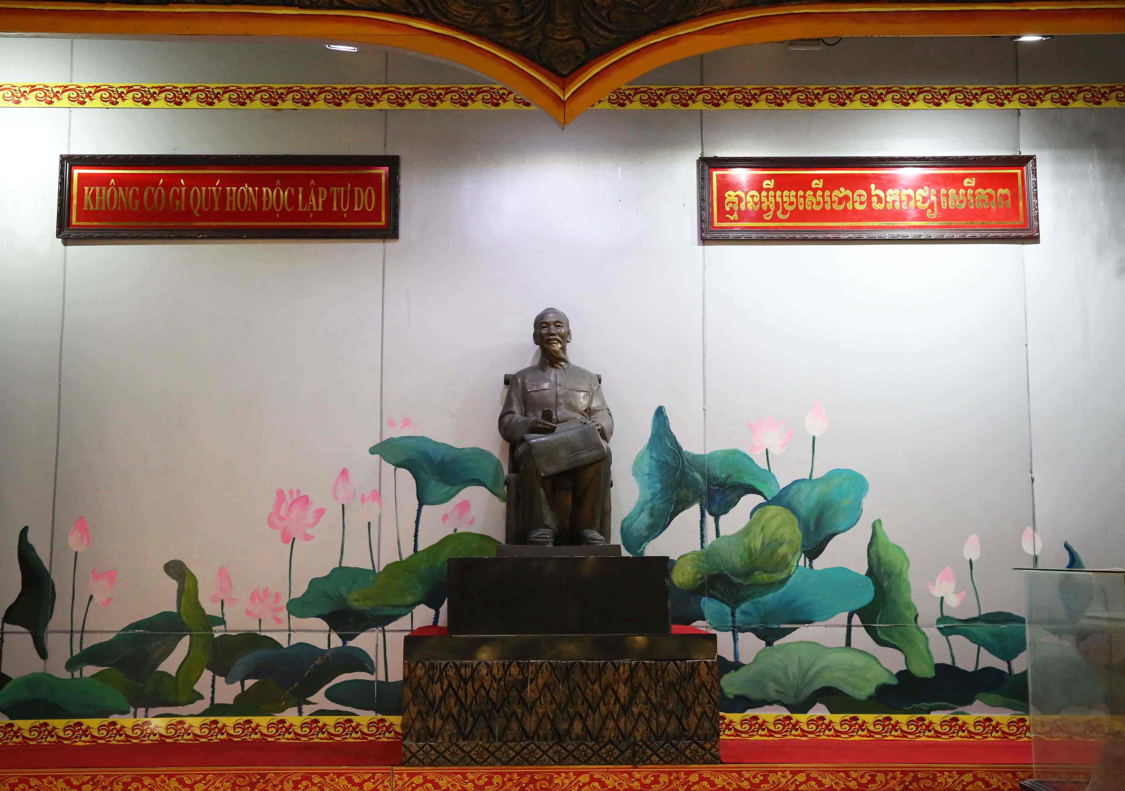 (左)抗仏戦争、抗米戦争を戦ったクメールの人や僧の顕彰 (右)懐かしいホーチミンの「独立と自由ほど尊いものはない」のスローガン
